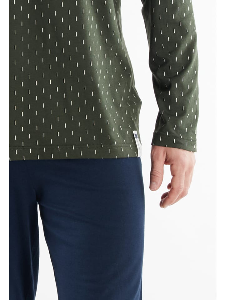 Стильный внешний вид сочетается с высоким качеством - этот длинный пижамный комплект, изготовленный из приятного для кожи хлопка, удивительно прост и долговечен. При этом дышащая ткань обеспечивает сбалансированный микроклимат тела и эффективно впитывает влагу, не создавая ощущения влажности. Гармоничная цветовая гамма, свободный крой и модный V-образный вырез добавляют стильные детали. Идеально подходит для расслабленного и стильного образа после работы.