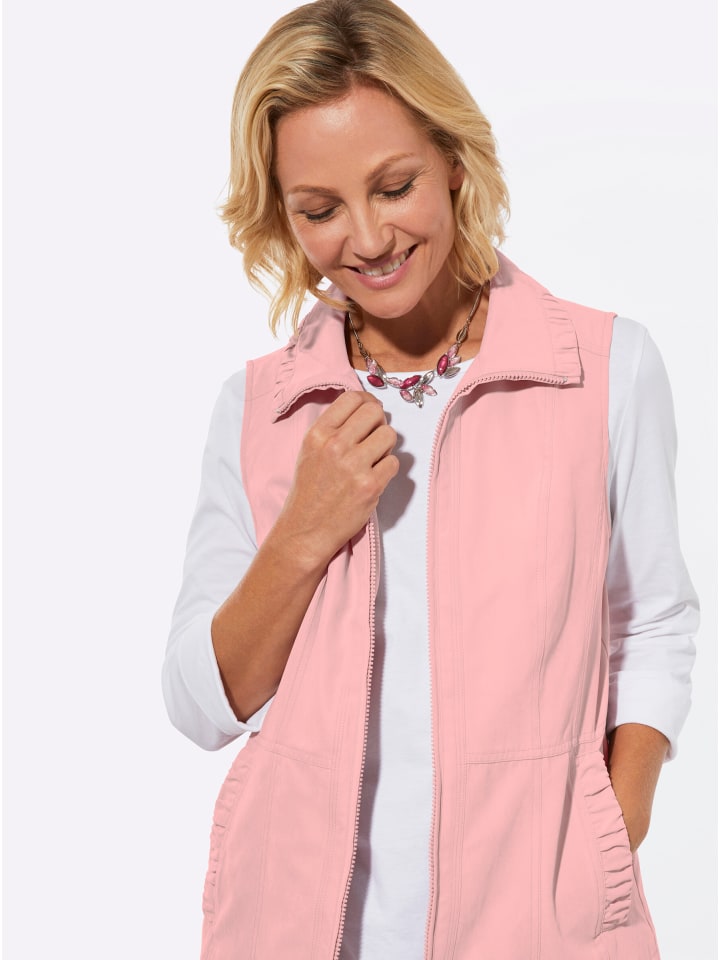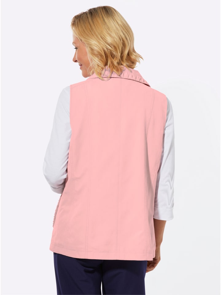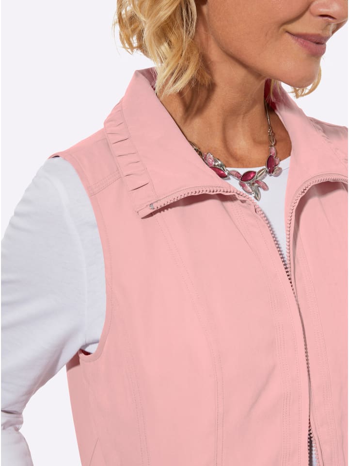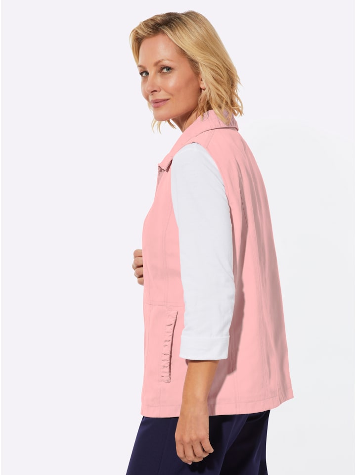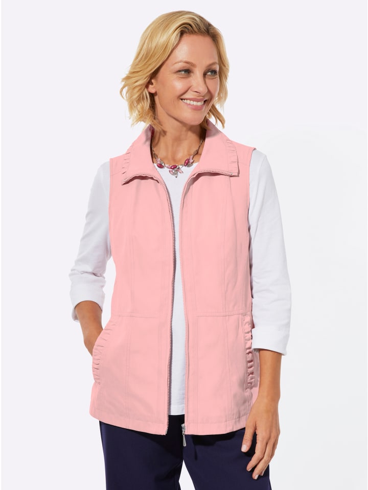Жилет из микрофибры, не требующей особого ухода. Привлекательные сборки на воротнике и карманах. Застежка-молния по всей длине, внутренний карман. Слегка наклонные кокетки спереди и сзади. С рельефными швами.