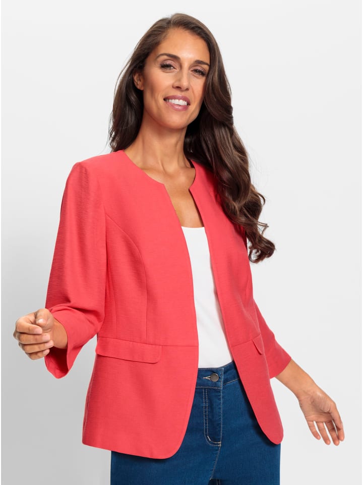 Популярный женский блейзер из матовой, мерцающей фактурной ткани. Открытый перед, круглый вырез горловины, рукава три четверти и декоративные клапаны. Рельефные швы обеспечивают идеальную посадку. Закругленный низ. Подкладка спереди.