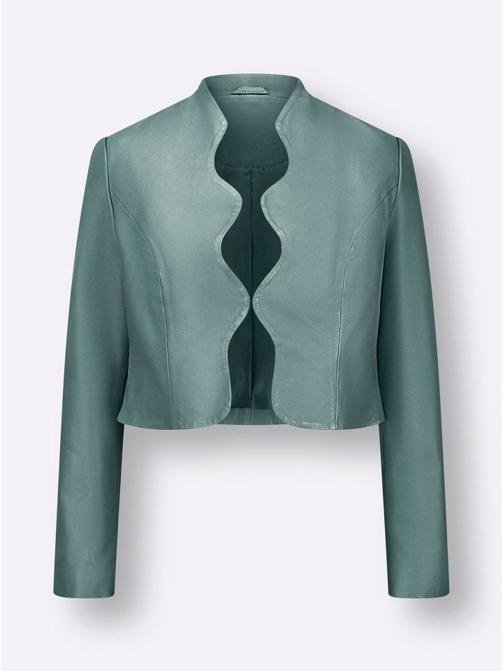 Этот высококачественный кожаный блейзер в женственном стиле болеро покорит даже иконы стиля. Современный открытый дизайн застегивается на потайной крючок по центру спереди. Особенно красивая деталь: закругленные и фестончатые края. Имеет длинные рукава и корректирующие швы для идеальной посадки по фигуре.