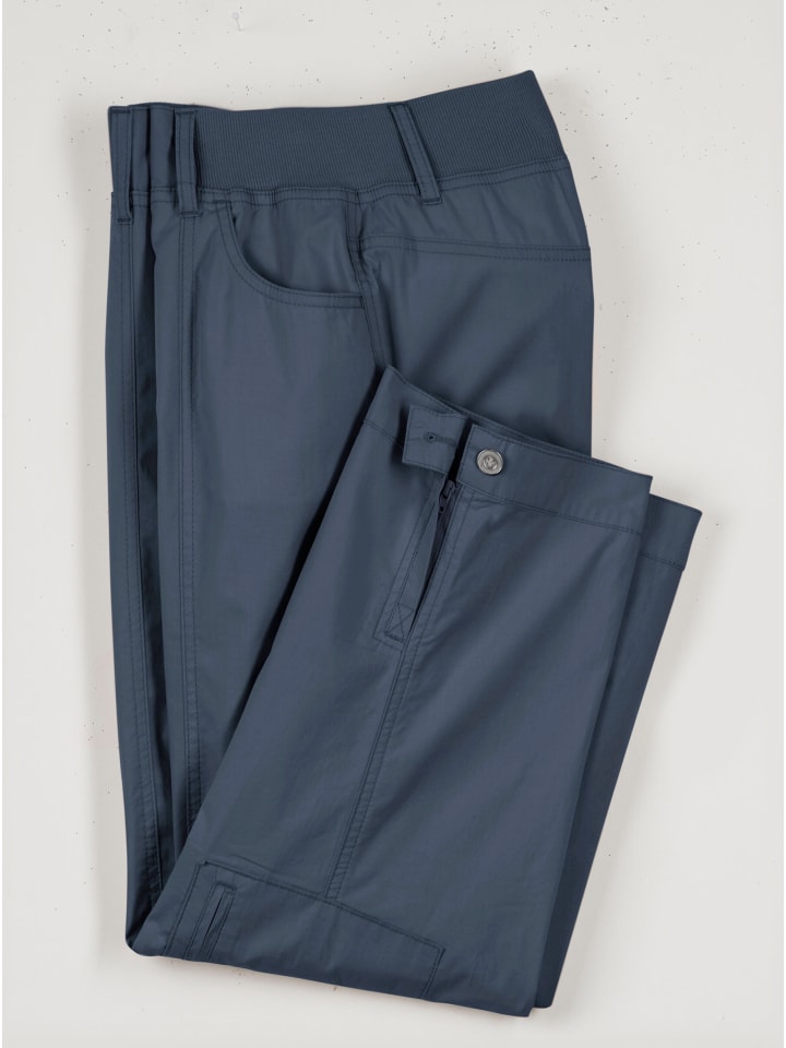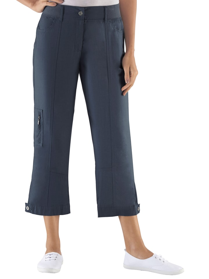 Повседневные брюки длиной до икр с удобным ребристым эластичным поясом, передняя панель гладкая. Застежка на пуговицу и молнию, шлевки для ремня. Кокетка сзади и эластичная ткань обеспечивают отличную посадку. Два передних кармана и один боковой карман на молнии. Особенно практичная деталь - молния с разрезом внизу штанины.