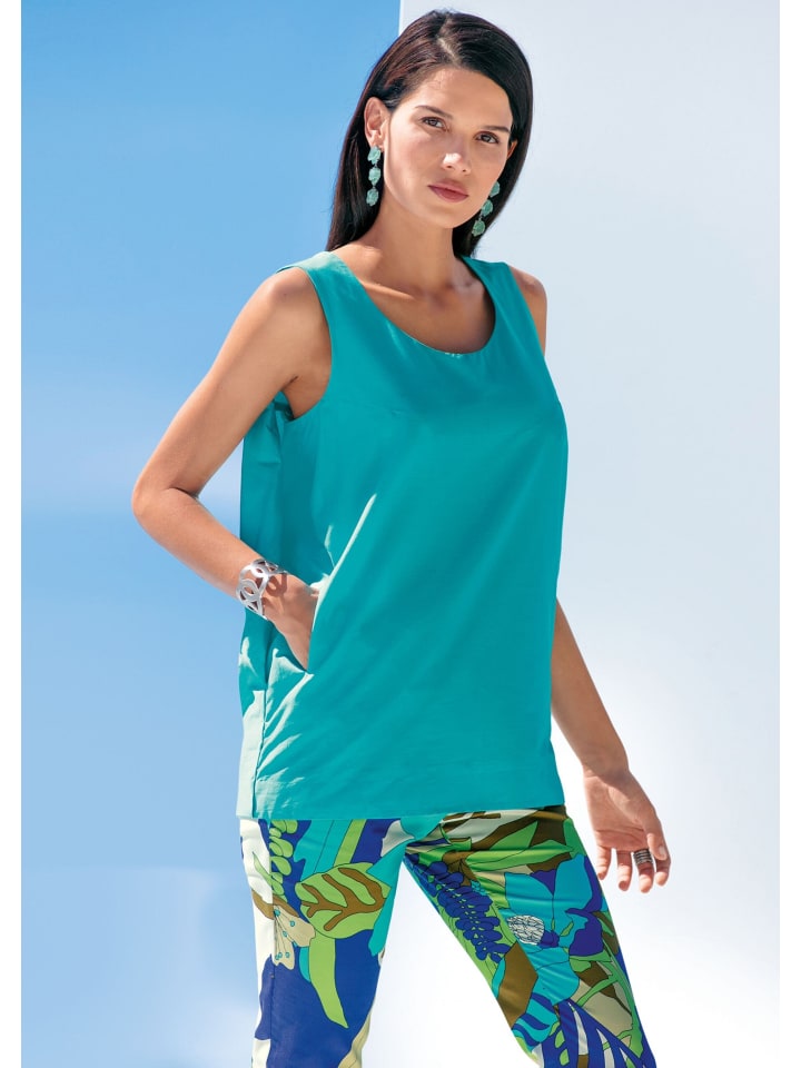 Блузка, задающая новый тренд своим свежим силуэтом. Современный силуэт O-образной формы мягко подчеркивает женскую фигуру. Мерцающая эластичная хлопковая ткань приятна на ощупь и излучает элегантность благодаря своей изысканной поверхности. Умело разработанный крой этой обновленной блузки обеспечивает свободную посадку, создавая несравненно женственный и элегантный образ. Без рукавов, со встроенными боковыми карманами, круглым вырезом и застежкой-молнией сзади, она демонстрирует современные детали. Длина около 70 см, до бедра. Блузка модного силуэта O-образной формы, свободная и женственная. Без рукавов, с круглым вырезом, боковыми карманами и застежкой-молнией сзади. Материал: 97% хлопок, 3% эластан