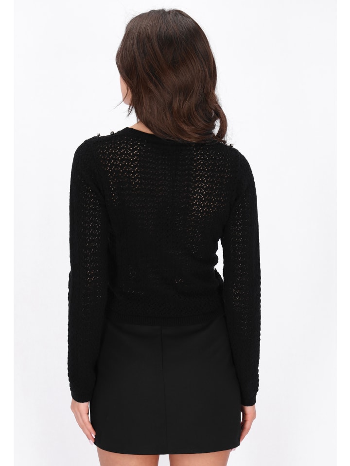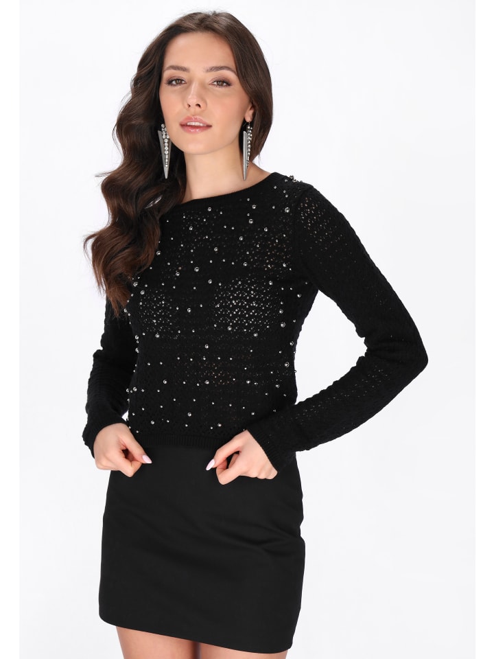 Этот свитер прямого кроя имеет классический круглый вырез и длинные рукава. Изготовлен из мягкой трикотажной ткани с изящным ажурным узором, украшен тонкими бусинками для придания блеска. Удобный и уютный, он идеально подходит для повседневной носки и праздничных случаев, входит в праздничную коллекцию.