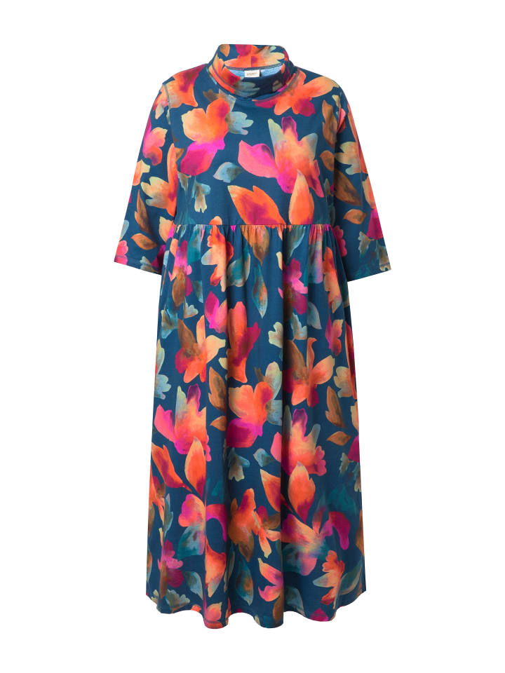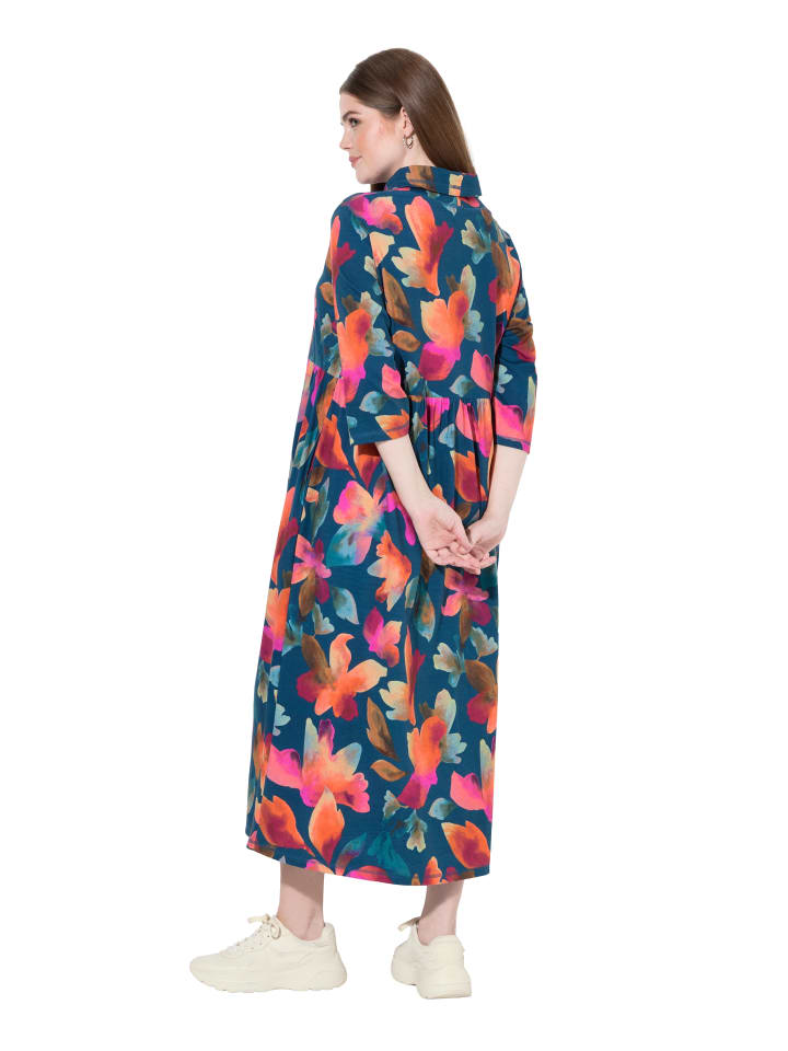 Длинное платье из органического хлопкового трикотажа, свободного кроя, с ярким цветочным узором и сборками по горизонтальному шву ниже талии. Пышная юбка. Широкий воротник-стойка, рукава 3/4, боковые карманы. Органический продукт; сертифицировано ECOCERT Greenlife, лицензия № 152026.