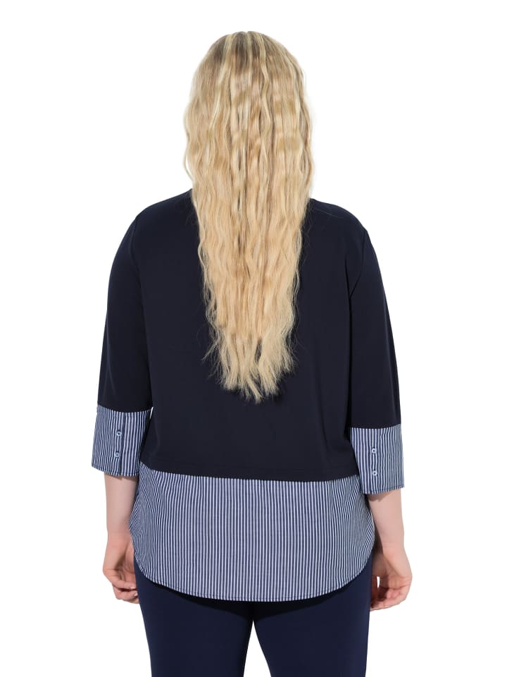 Толстовка удобного кроя, изготовлена из мягкой ткани для толстовок с деталями блузки из тонкого полосатого поплина - в виде широкого низа и манжет на рукавах 3/4. Толстовка с круглым вырезом и приспущенными плечами. Блузка с закругленным низом и боковыми разрезами на пуговицах - для еще большего комфорта.