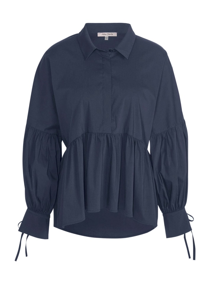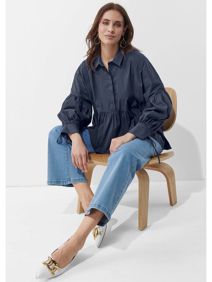 Блузка с игривым характером. Спущенные плечи. Небольшая баска. Потайная застежка на пуговицы. Плиссированные рукава для дополнительного объема. Манжеты с завязками. Длина в размере 38 примерно 60 см. Рубашечный воротник. Длинные рукава. Машинная стирка. Материал: 73% хлопок, 23% полиамид, 4% эластан.