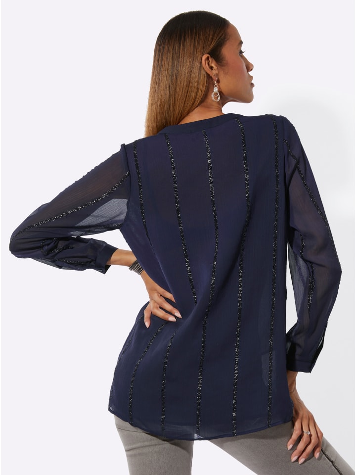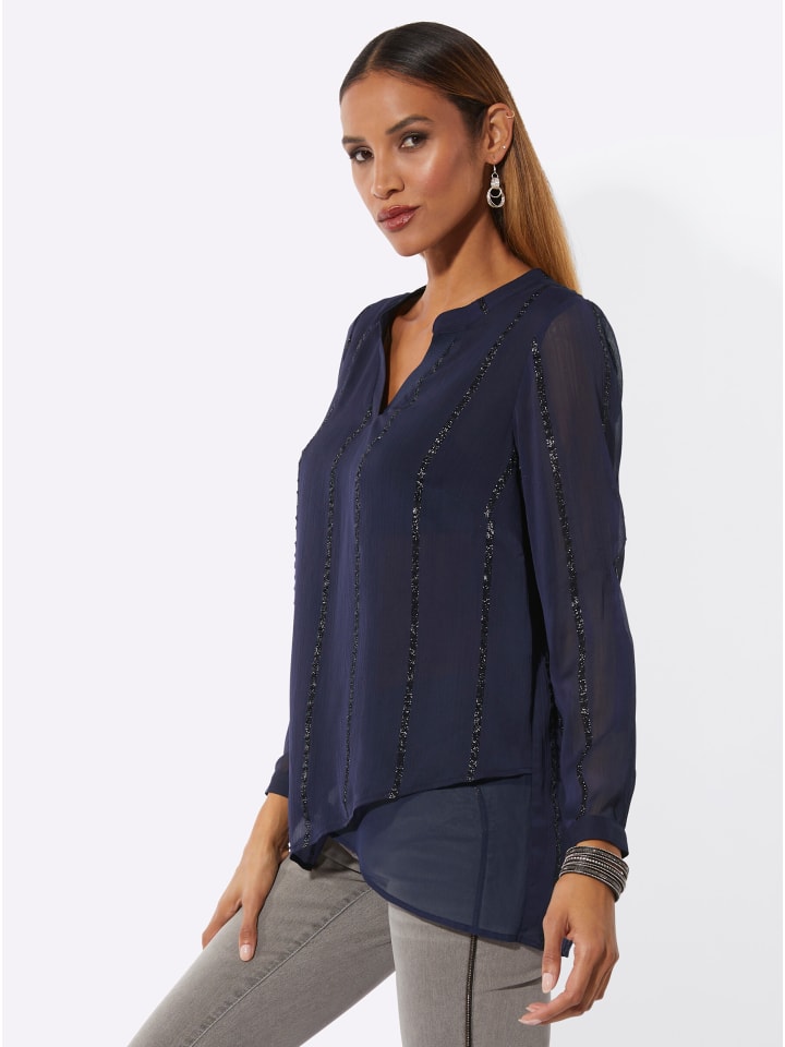 Что же так привлекает в этой длинной блузке? Несомненным достоинством является двухслойная передняя часть с элегантно переливающимися жаккардовыми полосами. Перекрещивающийся подол добавляет ей эксклюзивности. Блузка имеет длинные рукава с манжетами, которые можно укоротить до длины три четверти с помощью застежки и пуговицы. Спинка немного длиннее и имеет закругленную форму. - Переливающаяся тканая пряжа - Модный удлиненный силуэт. Материал: 100% полиэстер