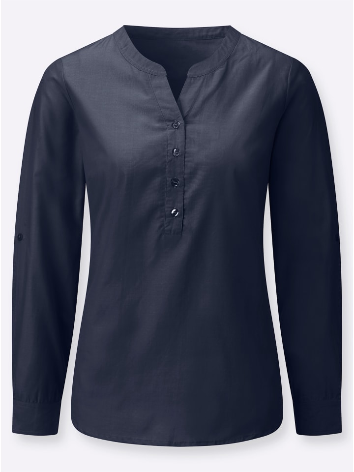 Эта туника-блузка - незаменимый элемент гардероба! Она имеет круглый вырез с открытым V-образным вырезом и короткую планку на пуговицах. Вытачки на груди обеспечивают привлекательный силуэт, а складка сзади - комфорт. Длинные рукава можно подвернуть до длины три четверти и закрепить пуговицей и хлястиком. Завершает образ слегка закругленный низ. Поддерживает инициативу «Хлопок, произведенный в Африке».