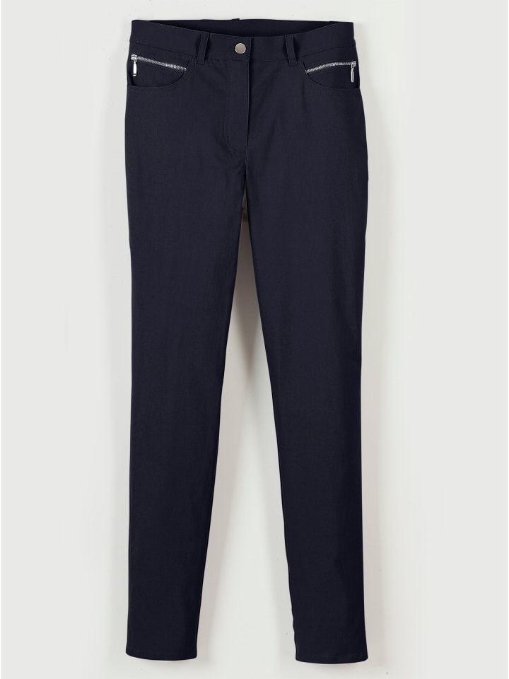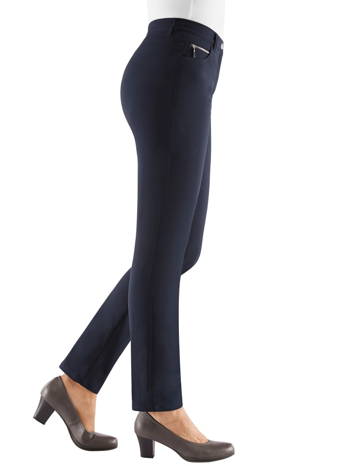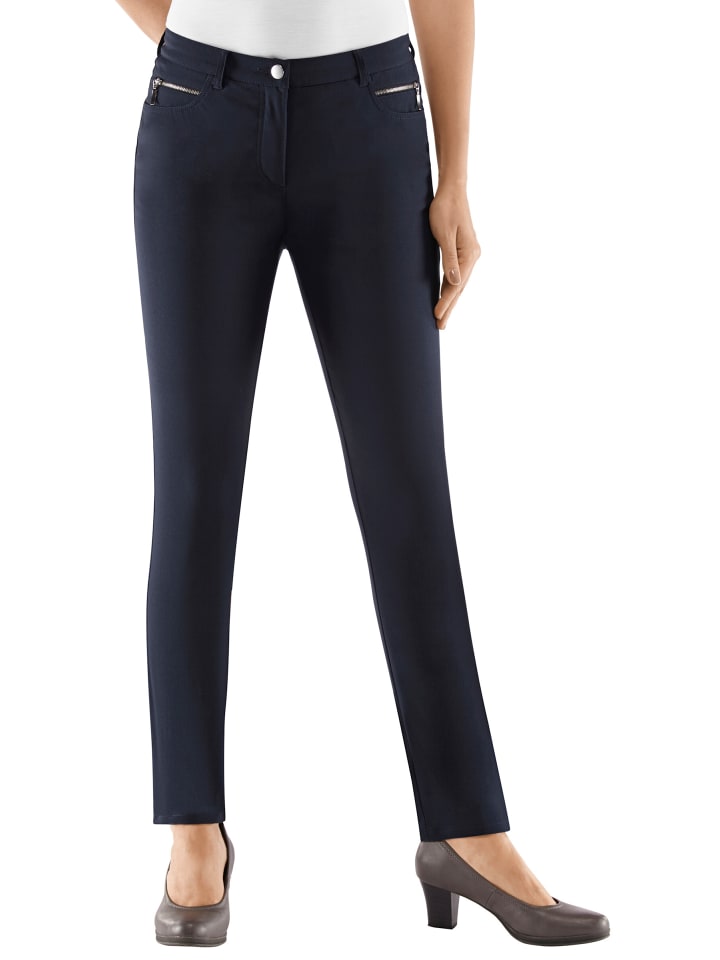 Ваши любимые - теперь в зимнем варианте! Брюки из высококачественной термоткани бенгалин - с мягкой внутренней подкладкой. Они идеально сидят, обеспечивают прекрасную свободу движений и всегда сохраняют свою форму! С фиксированным поясом, застежкой на пуговицу и молнию, а также петлями для ремня. Два закругленных кармана и два декоративных кармана с декоративными молниями. Ширина штанины внизу около 40 см. Ремень в комплект не входит.