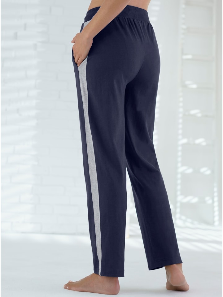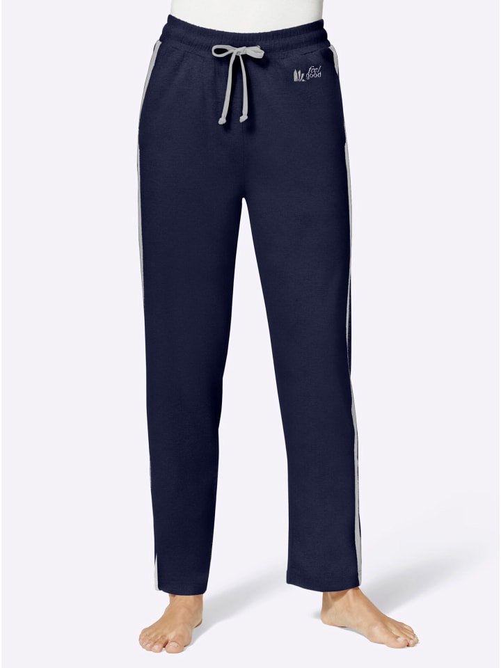 Брюки с широким эластичным поясом и шнурком. С двумя карманами. Особенно приятная деталь: контрастные боковые вставки и вышивка «feel good» слева на уровне пояса. Ткань интерлок, сохраняющая форму.