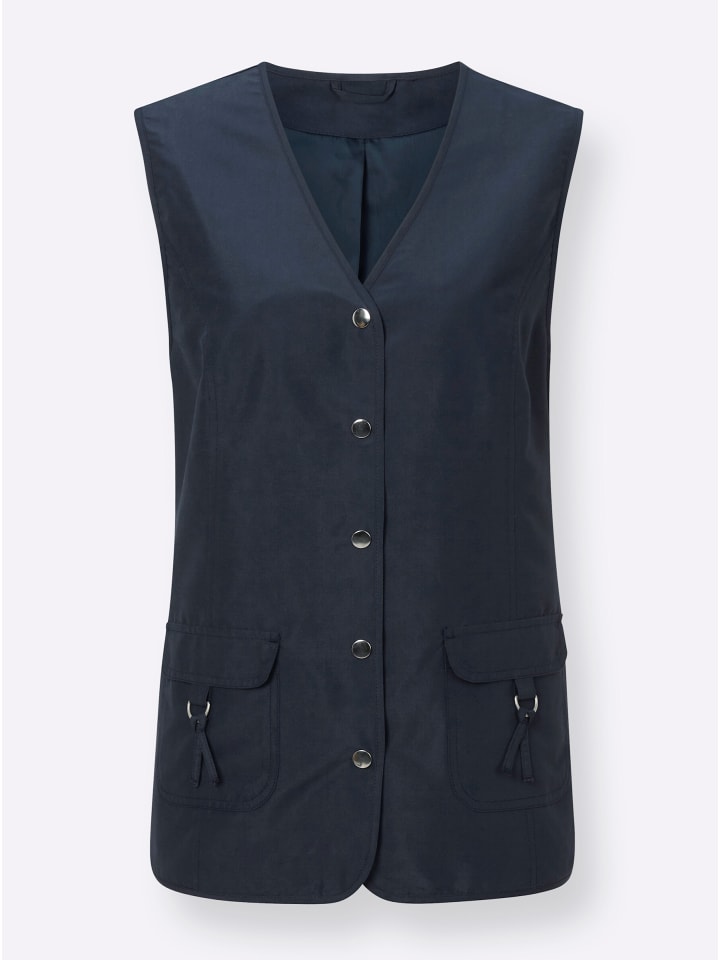 Стильный жилет с изящными изогнутыми швами, создающими силуэт, выгодно подчеркивающий фигуру! V-образный вырез переходит в практичную планку на кнопках. Два передних кармана с декоративными лямками и украшениями. Чрезвычайно прост в уходе и универсален.