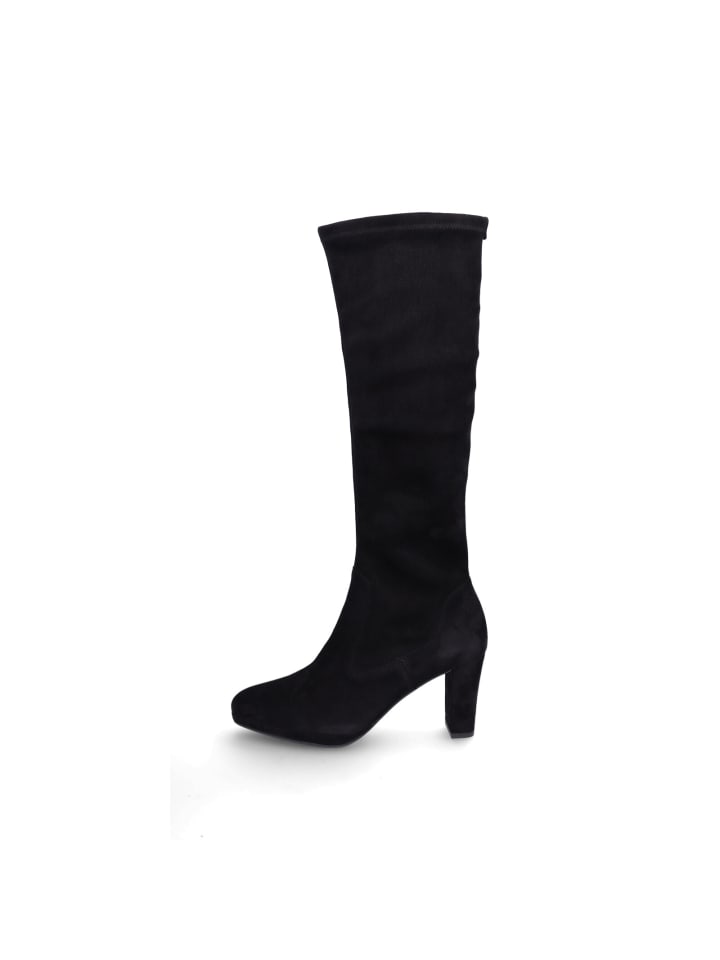 Женские высокие сапоги без шнурков от Peter Kaiser из черной замши с эластичным голенищем, кожаной стелькой и блочным каблуком 8 см.