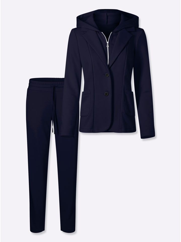 Брючный костюм в спортивном, модном стиле. Пиджак в стиле «2 в 1» с отложным лацканом. Изящная вставка с молнией и капюшоном. Застежка на две пуговицы. С двумя накладными карманами. Длина около 66 см. Брюки с эластичным поясом и шнурком, а также карманами на молнии и задними карманами. С декоративной боковой полосой. Стандартная посадка. Комфортный крой. Ширина штанины внизу около 34 см. Поддерживает инициативу «Хлопок, произведенный в Африке».