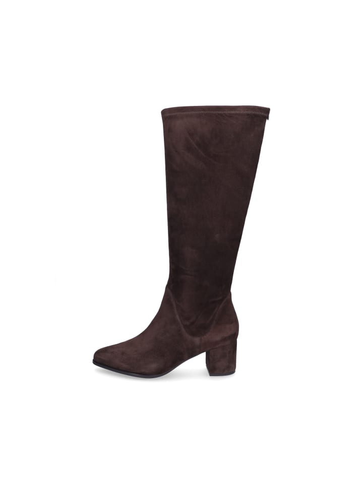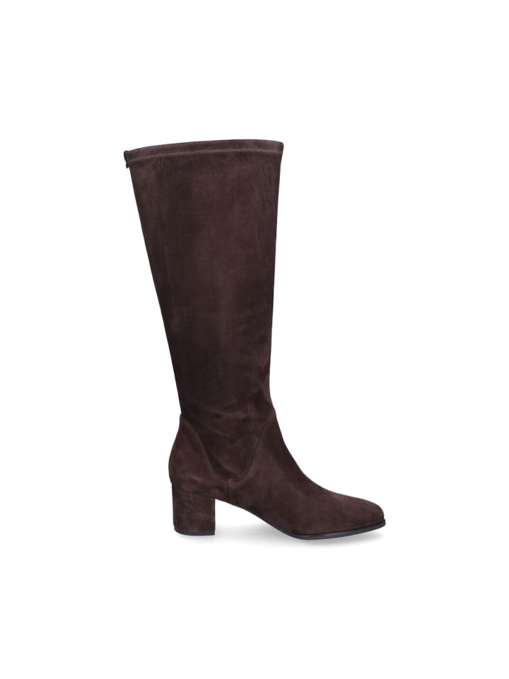 Женские сапоги до колена от Peter Kaiser из темно-коричневой замши с эластичным голенищем, кожаной стелькой и блочным каблуком высотой 6 см. Верх: 100% кожа; Подкладка: 100% кожа; Стелька: 100% кожа; Подошва: 100% другие материалы.