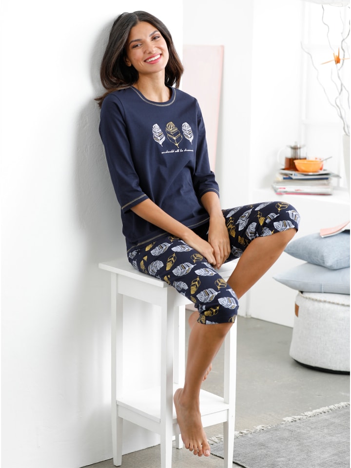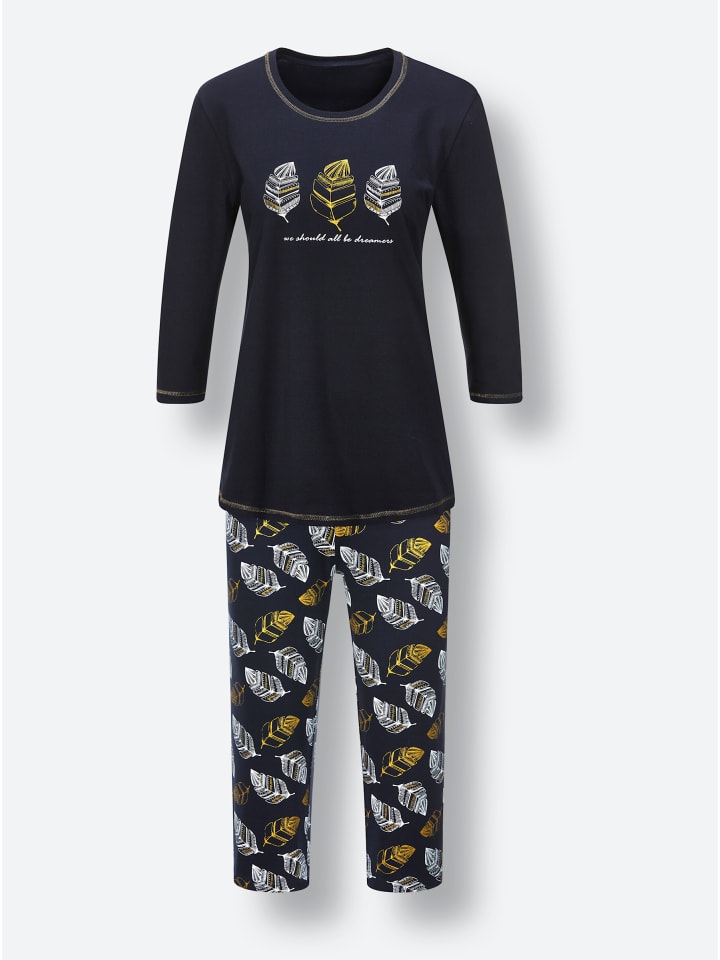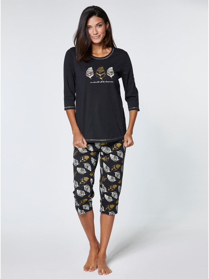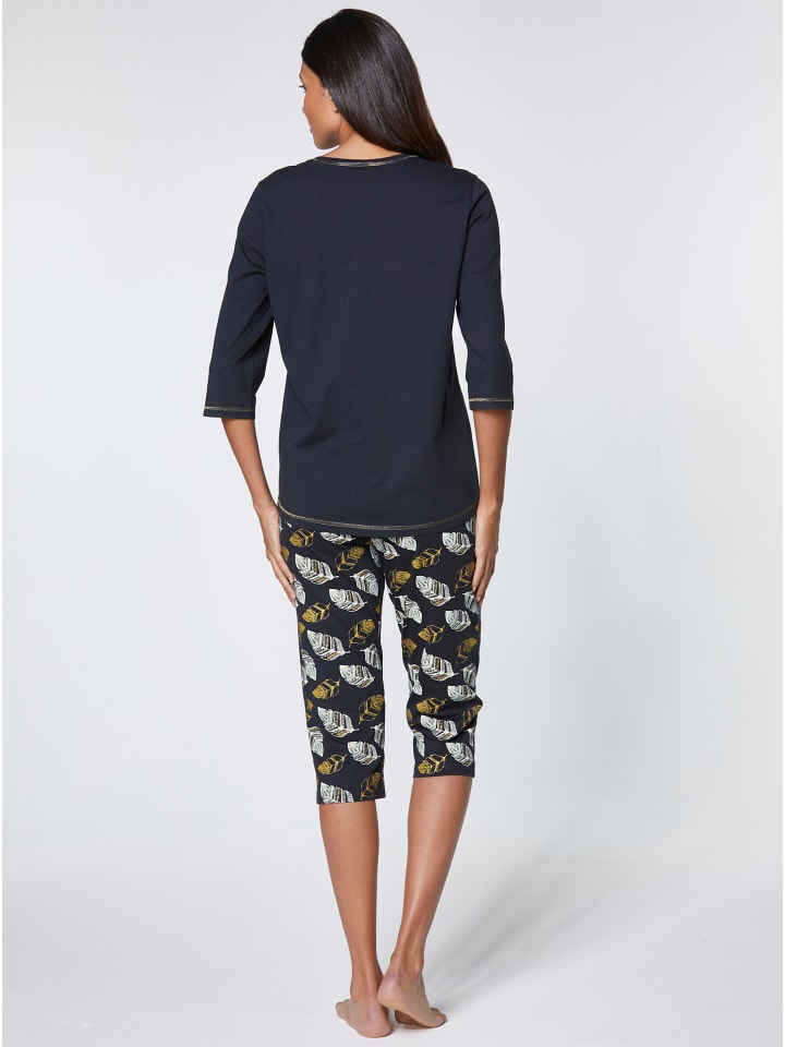 Не переворачивайте страницу! Этот пижамный комплект от Wäschepur впечатляет тщательно расположенным принтом в виде листьев на передней части. Контрастная строчка украшает круглый вырез горловины, манжеты рукавов три четверти и нижний край. Брюки-капри с удобным эластичным поясом украшены модным принтом в виде листьев, некоторые из которых слегка мерцают. - Трикотажное полотно - Золотистые блестки Материал: 100% хлопок