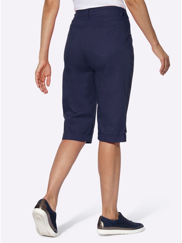 Для теплых дней года: шорты-бермуды из легкого хлопка с анатомическим поясом, петлями для ремня и застежкой на пуговицу и молнию. Два передних кармана украшены заклепками, а два задних - накладные. Приятная деталь: штанины можно подвернуть с помощью петель и кнопок. Швы визуально удлиняют штанины. Ширина штанины внизу около 50 см. Ремень в комплект не входит. Поддерживает инициативу «Хлопок, произведенный в Африке».