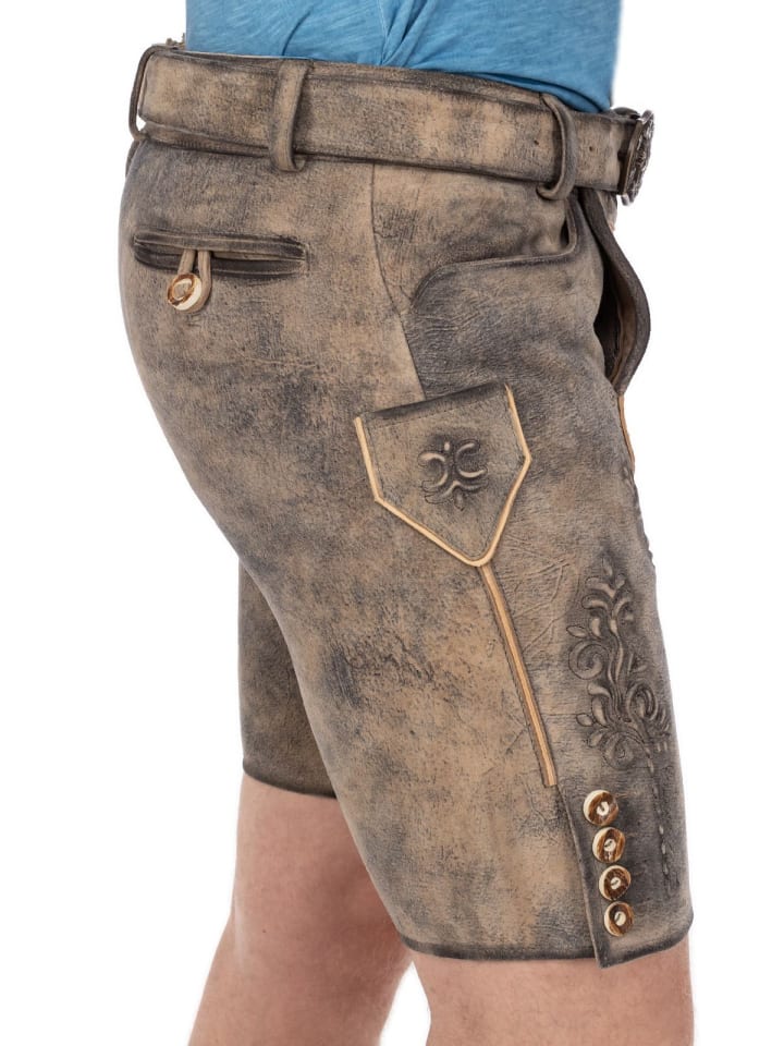 Короткие кожаные бриджи "WERNHART" от Maddox - это шедевр традиционной одежды, воплощающий идеальное сочетание традиционной элегантности и современного дизайна. Выполненные в изысканной мраморно-бежевой цветовой гамме, эти бриджи излучают вневременную классику и производят сильное впечатление своими традиционными украшениями. - Кожаные бриджи - Ремень в комплекте - Традиционные кожаные бриджи - Размер соответствует стандартному. Материал: 100% кожа