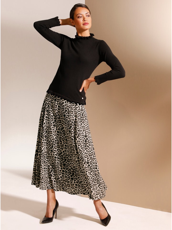 Свитер из вискозы и модала. Он отличается исключительной мягкостью и комфортом, а также игривым видом: оборки на воротнике-стойке, мягкие фестончатые края на длинных рукавах и подоле. Тщательно связан по фигуре.