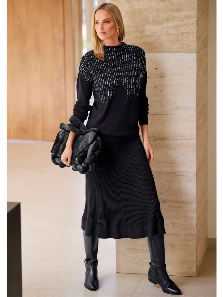 Свитер с эффектными аппликациями из страз на передней части. Имеет воротник-стойку, приспущенные плечи, длинные рукава и ребристые манжеты.