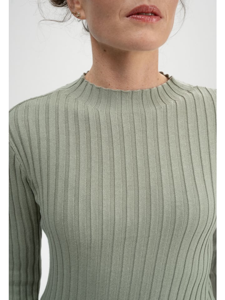 Этот легкий вязаный свитер впечатляет своей тонкой ребристой текстурой, облегающим силуэтом и коротким воротником-стойкой. Изготовленный из 100% органического хлопка, произведенного по принципам справедливой торговли, он не имеет ребристых манжет, что придает ему чистый и современный вид. Обратите внимание, что мы намеренно не добавляем эластан в нашу ребристую трикотажную ткань. Поэтому свитер со временем естественным образом растянется и приобретет более свободный крой.