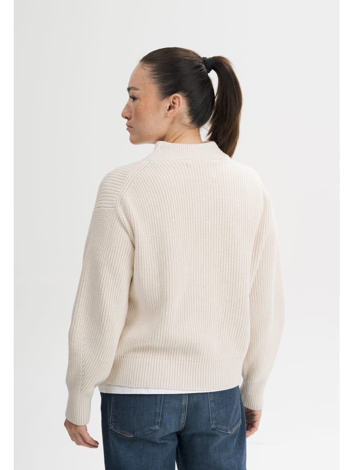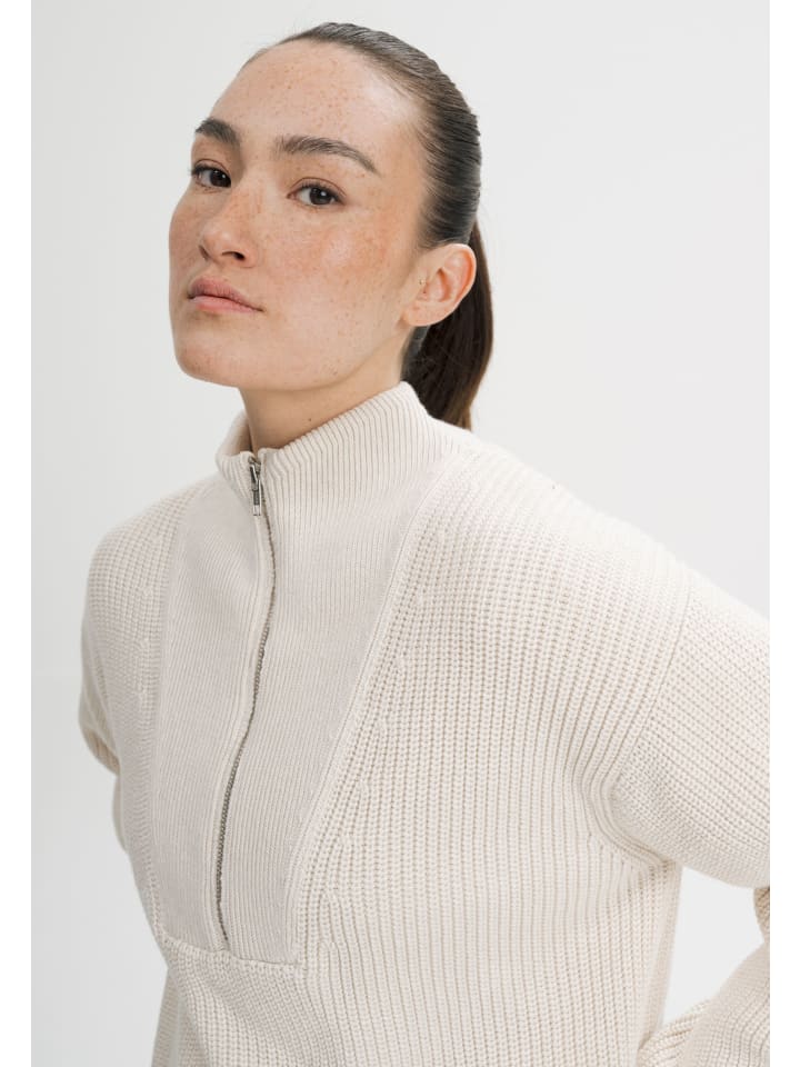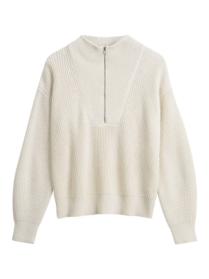 Этот современный повседневный свитер - классическая вещь, которая обязательно должна быть в вашем гардеробе. Он изготовлен из теплой ребристой вязки, имеет воротник-стойку и застежку-молнию YKK до середины груди.