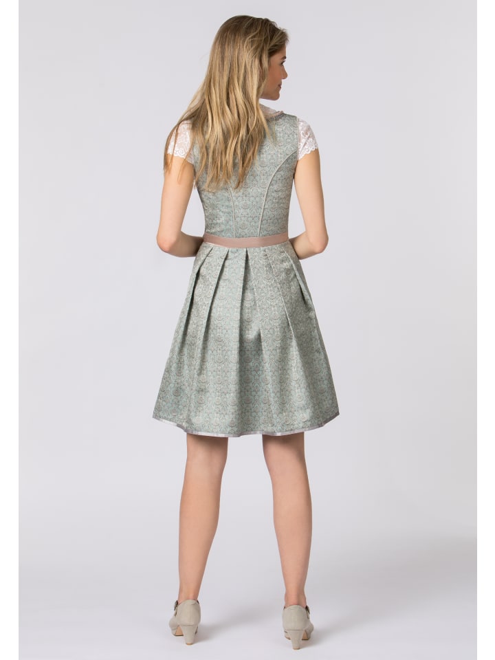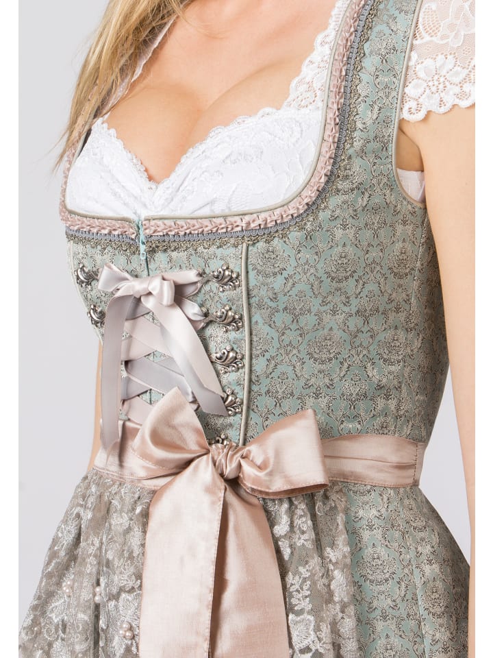 Дирндль «Шила» с кружевным фартуком для женщин от Wiesnwuid мятного цвета. Этот стильный дирндль впечатляет модным жаккардовым узором и очаровательными деталями. Элегантные оборки на вырезе, пришитая декоративная отделка и украшенные крючки на лифе добавляют женственности. Шнуровка из двух разноцветных атласных лент еще больше подчеркивает женственность. Нежный кружевной фартук в тон платья искусно дополняет весь ансамбль. Сочетайте его с белой блузкой-дирдлем Jasmin.