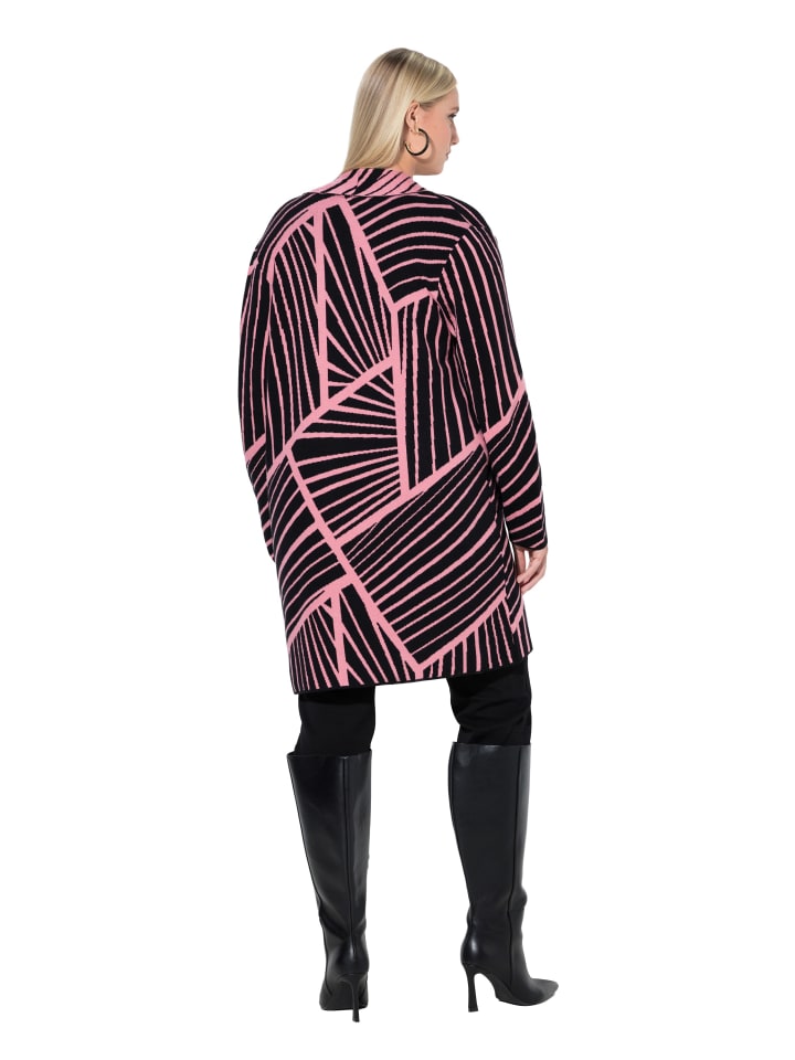 Длинный кардиган, удлиненный, свободного кроя, из мягкого жаккардового трикотажа с графическим рисунком. Воротник-шаль, два накладных кармана, длинные рукава.