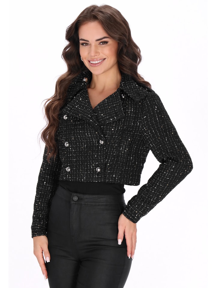 - Укороченный блейзер с воротником-стойкой и длинными рукавами