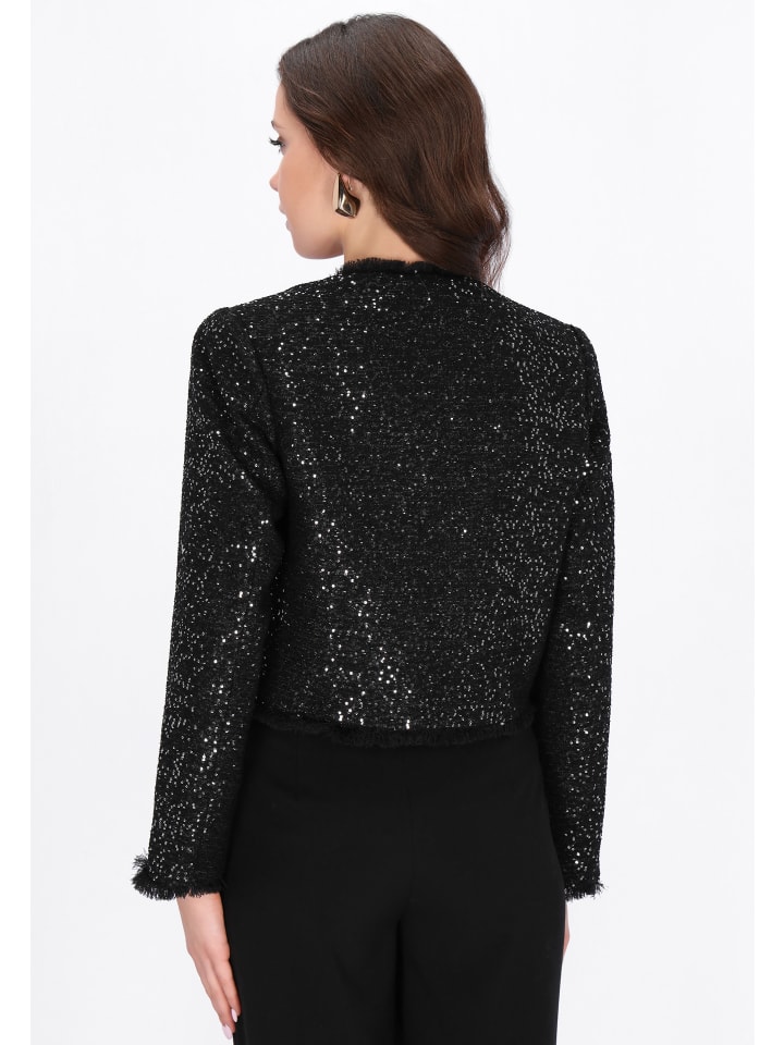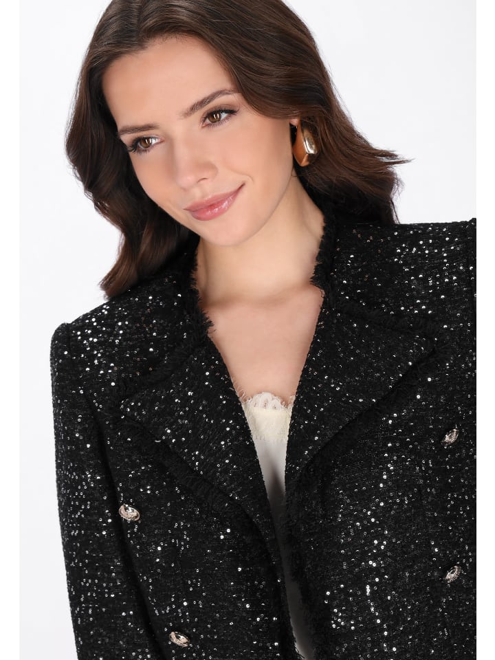 Ослепительный блейзер из коллекции Festival, сочетающий классическую элегантность с блестящими деталями. Этот блейзер прямого кроя, укороченной длины, с отложным воротником, длинными рукавами и планкой на двух пуговицах с декоративными элементами, имеет необработанный край и изготовлен из букле с пайетками и блестящей текстурированной тканью, что делает его идеальным выбором для особых случаев и праздничных мероприятий.