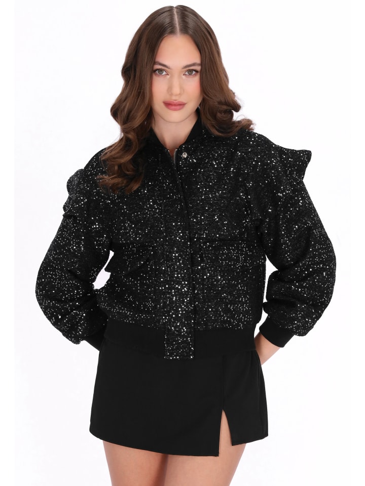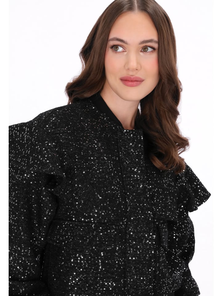 Стильный блейзер прямого кроя, сочетающий классический стиль со смелыми декоративными деталями. Ребристый воротник и длинные рукава придают ему современный вид. Застежка-молния добавляет функциональности, а накладные карманы обеспечивают практичность. Нежные оборки и ребристый низ деликатно подчеркивают силуэт. Пайетки создают мерцающий узор на высококачественной ткани, придавая изделию неповторимый блеск. Идеальный выбор для особых случаев и торжественных мероприятий.