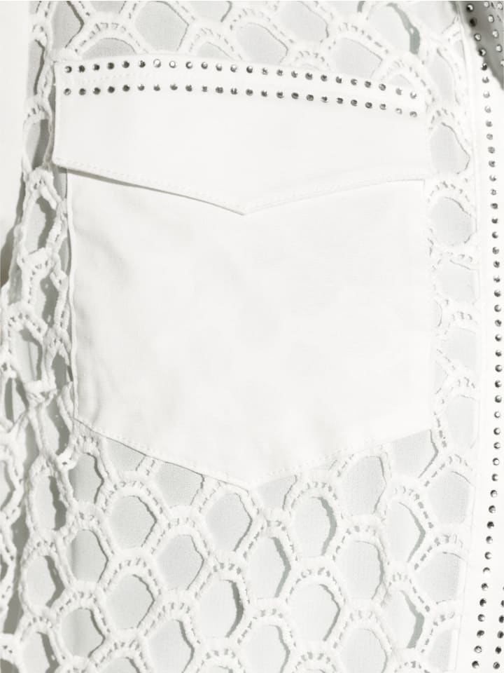 Эта слегка полупрозрачная кружевная куртка - просто высший класс! Передняя и задняя части имеют подкладку для полной непрозрачности, а длинные рукава позволяют немного обнажить кожу. Куртка имеет отложной воротник и застежки на кнопках. Главные изюминки: сверкающие стразы вдоль планки с пуговицами и на накладных карманах. Легкая летняя ткань. С декоративными стразами. Материал: 100% полиэстер