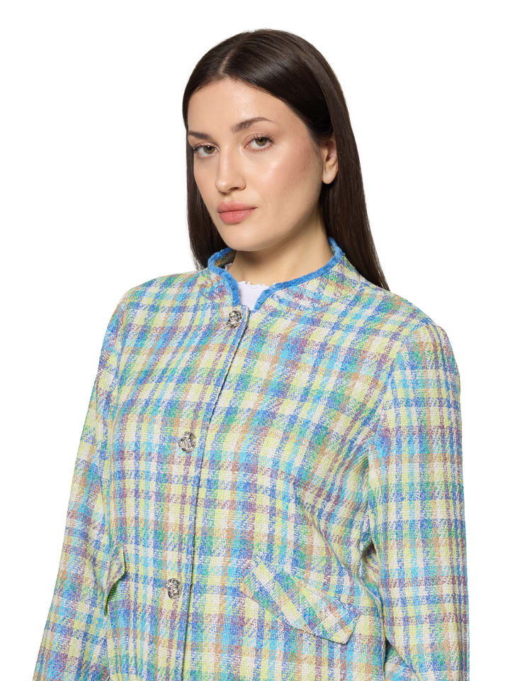 Пиджак свободного кроя с классической длиной рукавов, клетчатым узором и воротником-стойкой. Застежка на пуговицах добавляет современный штрих - идеально подходит для стильных, современных образов с элементами повседневности.