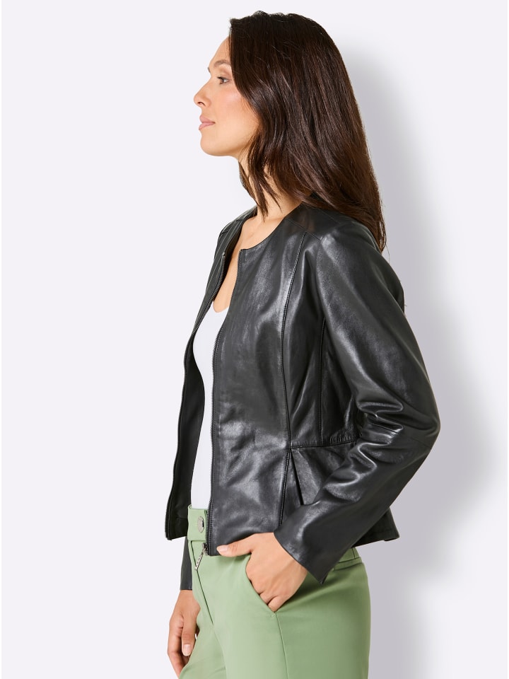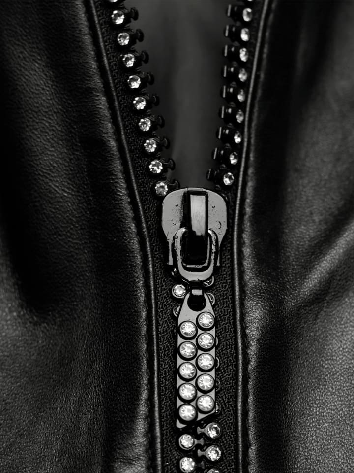 Этот высококачественный блейзер из овечьей кожи наппа в шикарном стиле с баской станет модным акцентом. Он имеет застежку-молнию по всей длине, украшенную элегантными стразами, длинные рукава с разрезами и корректирующие швы для создания привлекательного силуэта. Косые карманы и подкладка с логотипом завершают образ.