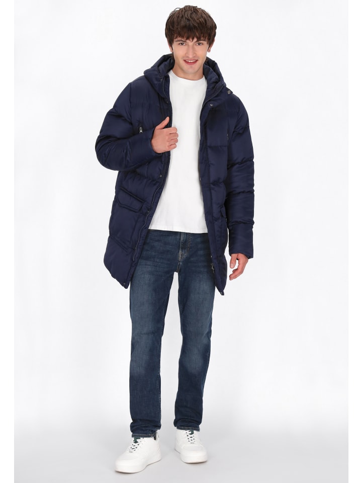 - Пуховая куртка прямого кроя с капюшоном и длинными рукавами