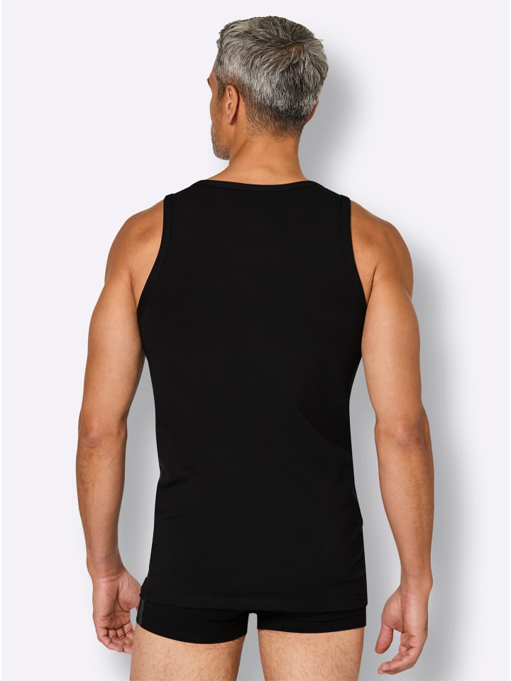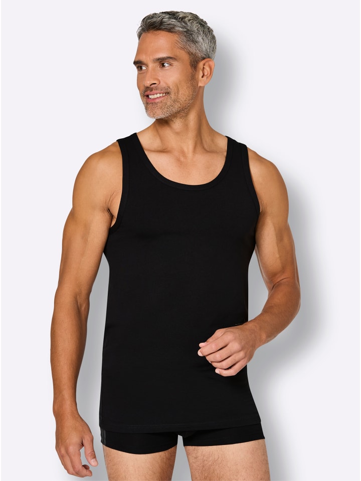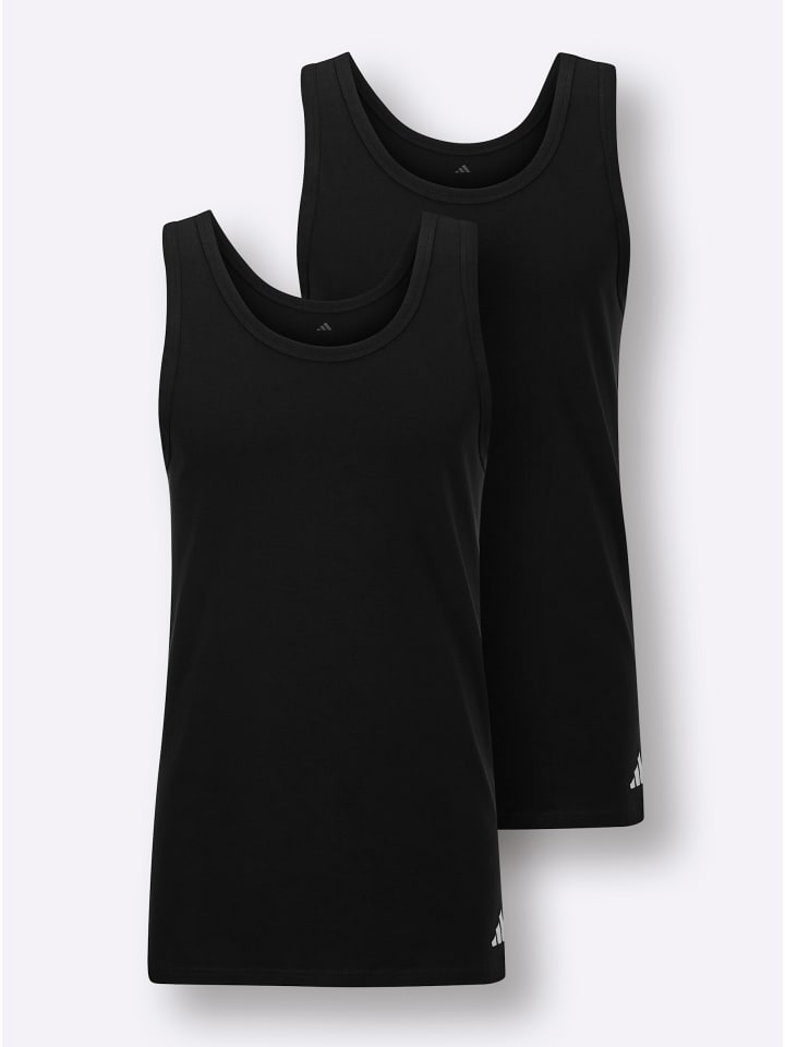 Комплект из двух вещей для НЕГО: Классическая майка из комфортного трикотажа от adidas. С окантовкой по краю горловины и пройм. Логотип на подоле сбоку.