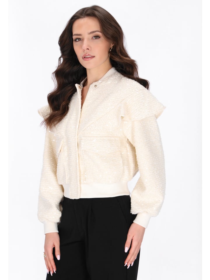 Подчеркните свой праздничный образ с помощью этой эффектной куртки из праздничной коллекции. Куртка прямого кроя с ребристым воротником и длинными рукавами создает структурированный, но комфортный силуэт. Застежка-молния спереди и ребристый низ добавляют современный штрих, а накладные карманы обеспечивают практичность. Куртка, изготовленная из фактурной букле-ткани, украшена оборками и сверкающими пайетками, создающими роскошный праздничный вид. Идеальный выбор для мероприятий и особых случаев, где стиль и элегантность сочетаются воедино.