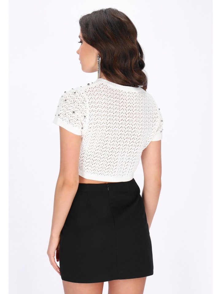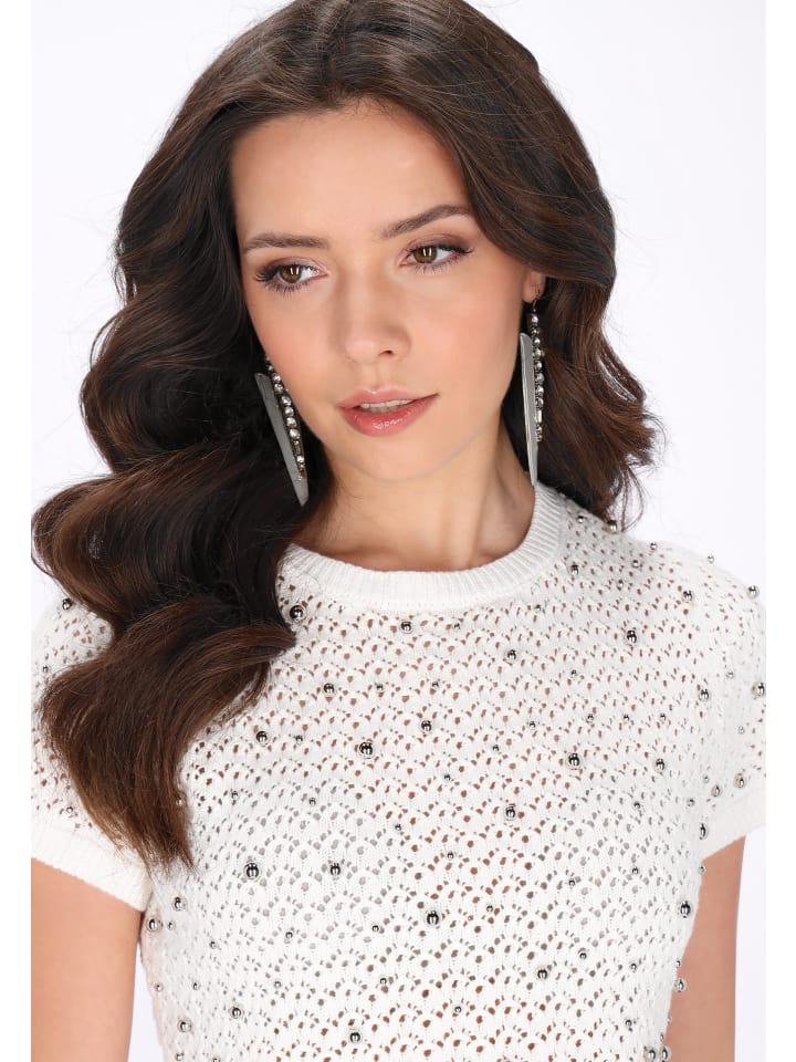 Стильная блузка прямого кроя укороченной длины, идеально сочетающая комфорт и декоративный элемент. Модель с круглым вырезом и короткими рукавами украшена изящной бисерной отделкой, добавляющей элегантности и нежного, праздничного настроения. Изготовленная из мягкой трикотажной ткани с ажурным узором, она обеспечивает комфорт и приятное ощущение уюта. Эта уютная и эффектная вещь из праздничной коллекции идеально подходит для особых случаев и стильных вечерних образов.