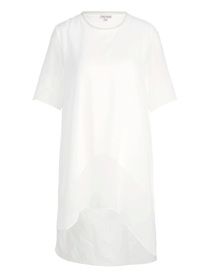 Рубашка из слегка прозрачной ткани, многослойная. Круглый вырез горловины с золотистыми блестящими нитями. Рукава до локтя. Декоративный разрез сзади. Длина для размера 38 примерно 52 см.