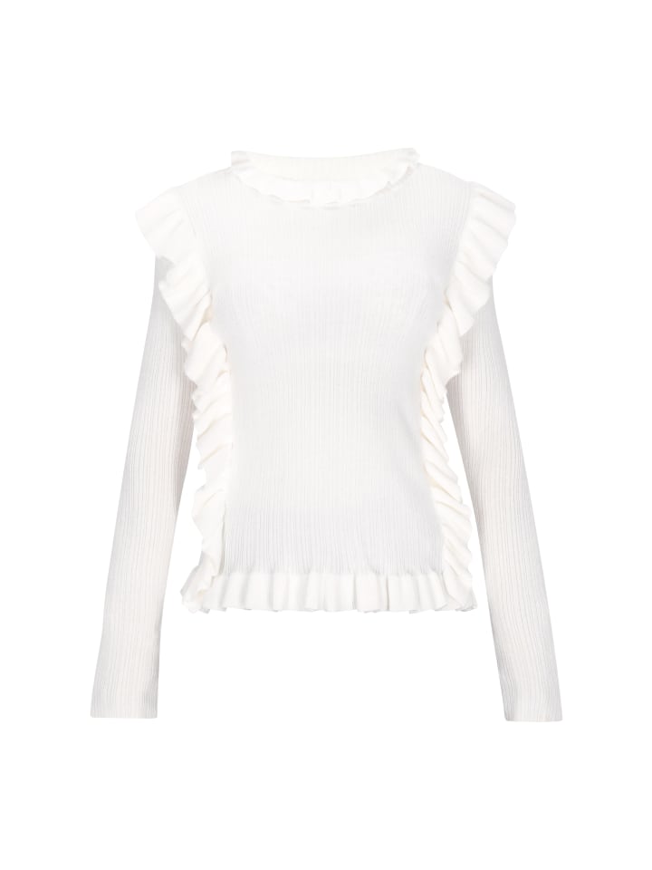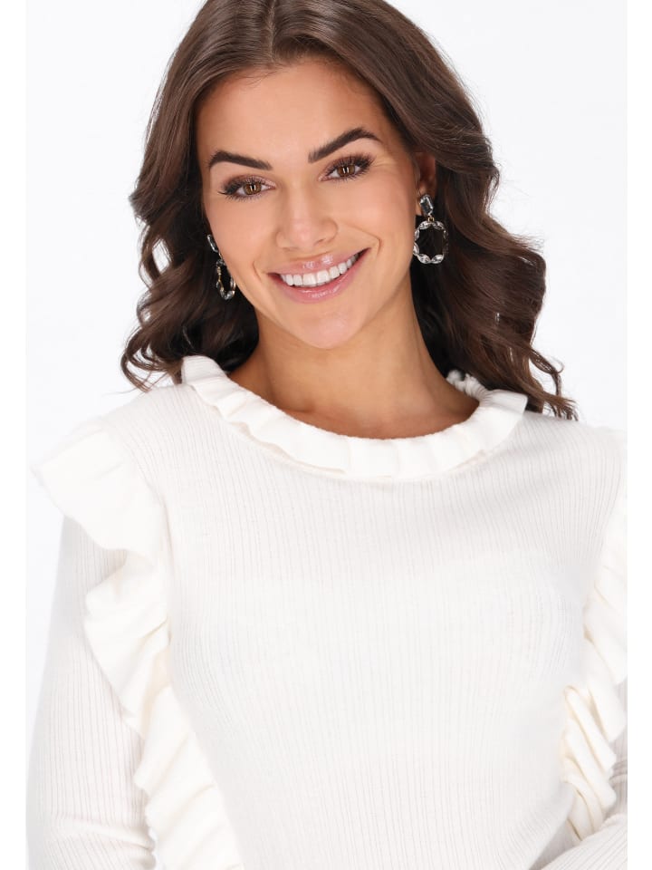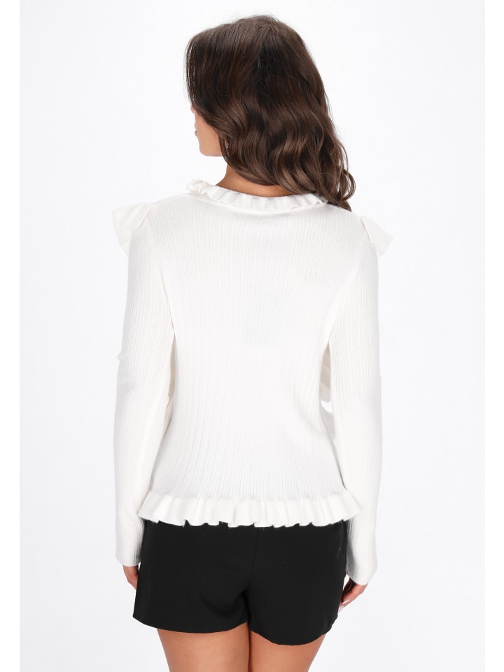 Удобный и практичный свитер прямого кроя, идеально подходящий для повседневной носки. Он имеет классический круглый вырез с оборкой, длинные рукава, оборку по низу и оборки спереди, добавляющие изюминку и легкость. Изготовленный из мягкой ребристой вязки, он обеспечивает комфорт и легкость в создании образов. Свитер из коллекции Faina сочетает в себе простоту и женственность, создавая универсальный элемент гардероба.