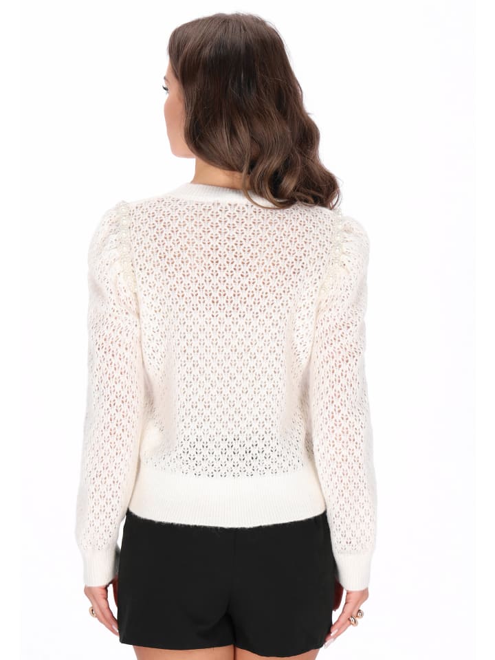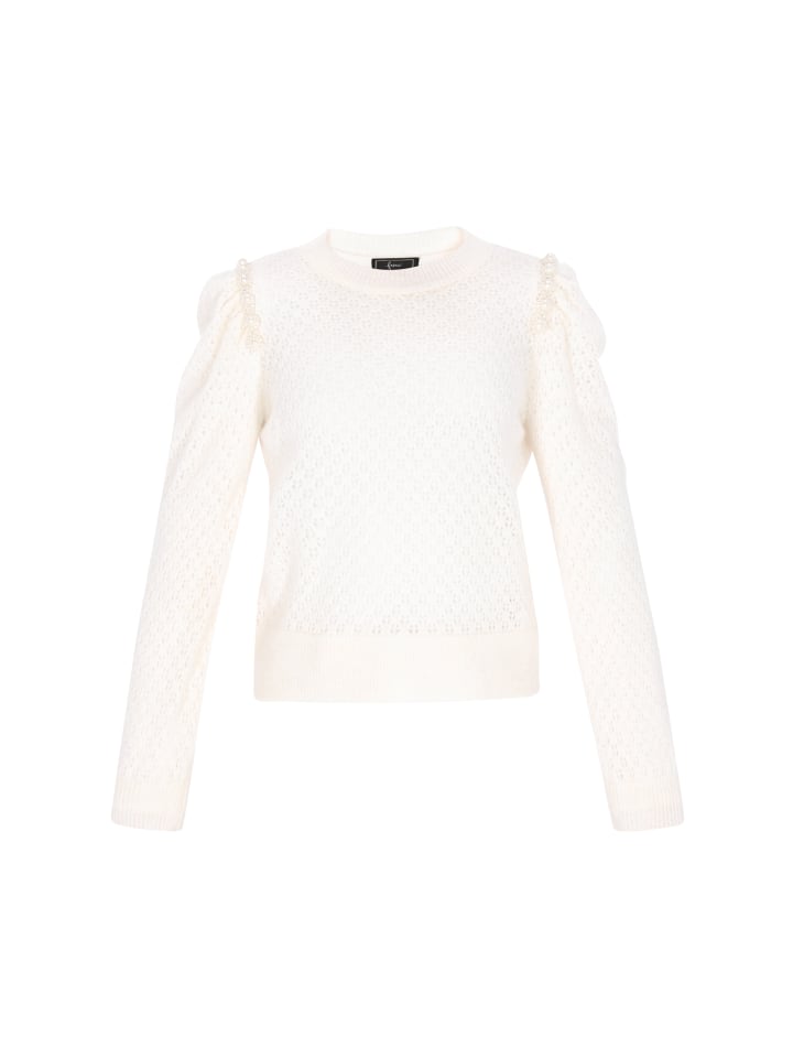Этот элегантный свитер классического кроя сочетает в себе женственное очарование и комфорт. Изготовленный из мягкой трикотажной ткани с ажурным узором, он очаровывает своими утонченными деталями. Длинные пышные рукава придают ему романтический оттенок, а декоративные жемчужины добавляют шика и праздничного шарма. Круглый вырез горловины красиво драпируется, обеспечивая комфорт в течение всего дня. Это идеальный выбор для праздничных встреч, торжественных ужинов или зимних нарядов с ноткой элегантности. Этот свитер сочетает в себе изящество и уникальность. Часть коллекции Faina.