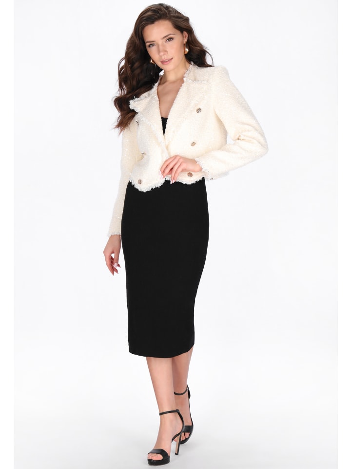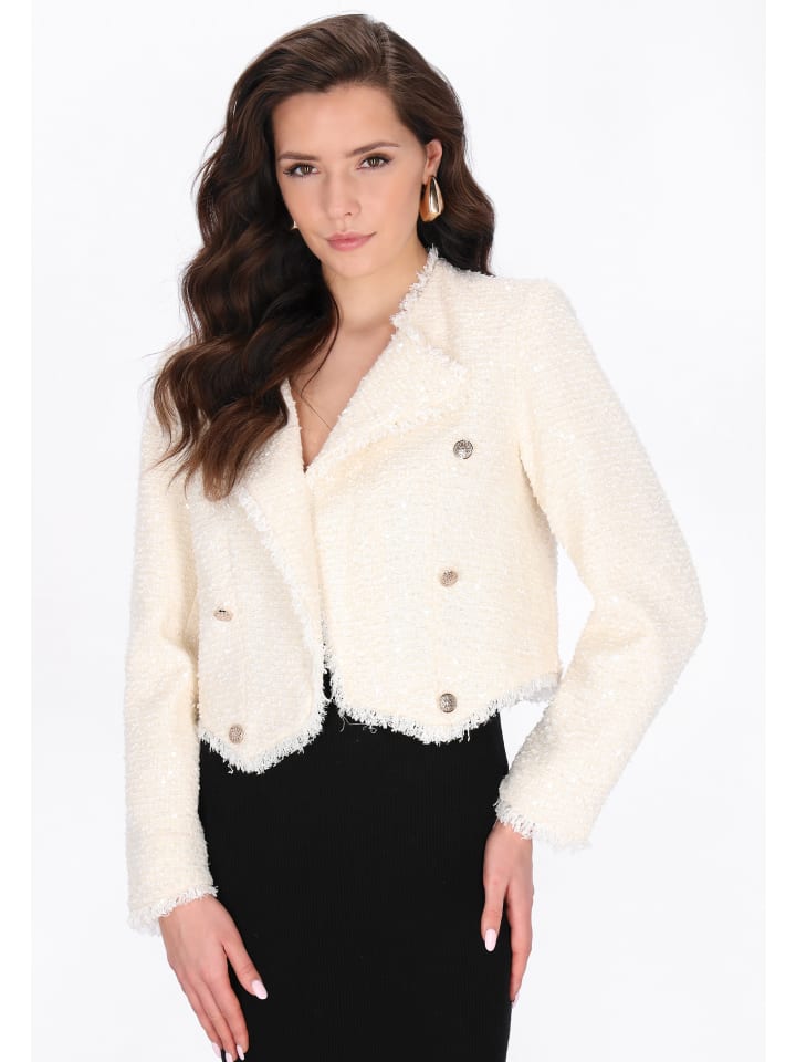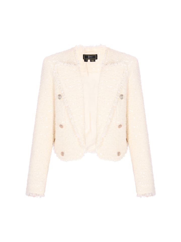 Эффектный блейзер из коллекции Festival, сочетающий элегантность с блестящими деталями. Этот блейзер прямого кроя, укороченной длины, с отложным воротником, длинными рукавами и планкой на двух пуговицах с декоративной отделкой, имеет необработанный край и изготовлен из букле с пайетками и блестящей текстурированной тканью, что делает его идеальным для особых случаев и праздничных мероприятий.