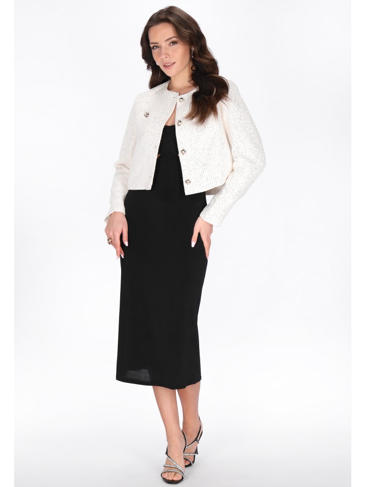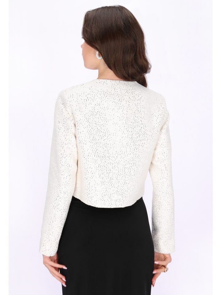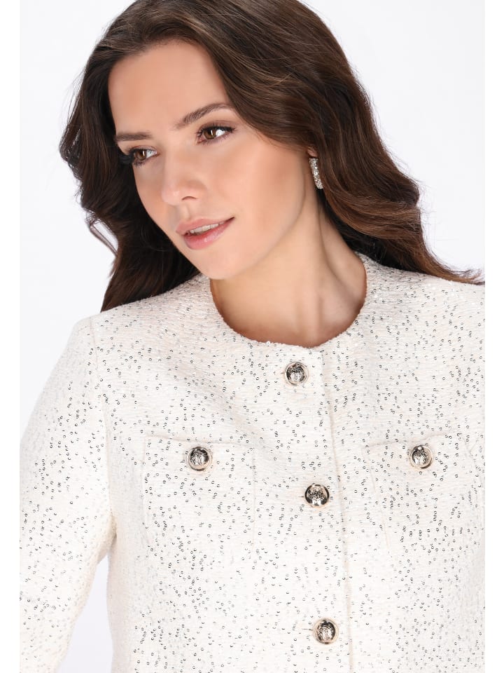 Подчеркните свой праздничный образ с помощью этого эффектного блейзера из праздничной коллекции. Блейзер прямого кроя с элегантной укороченной длиной, изысканным круглым вырезом и длинными рукавами создает утонченный силуэт. Изготовленный из фактурной букле-ткани, блейзер украшен сверкающими пайетками, создающими блестящий, привлекательный узор. Дополненный нагрудными карманами и классической однобортной застежкой, этот блейзер идеально подходит для праздничных случаев и особых мероприятий, где важен яркий стиль.