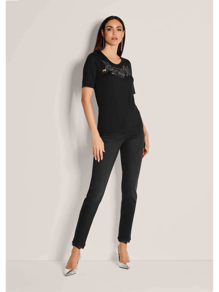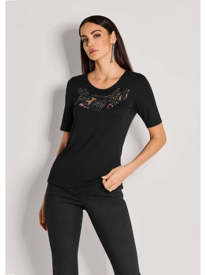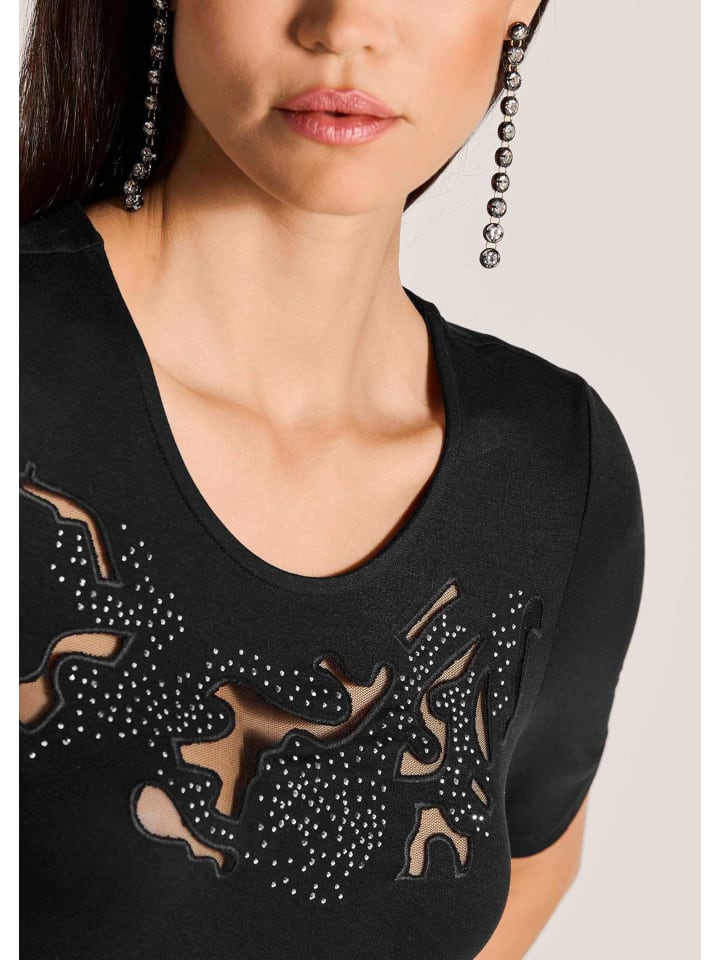 Соблазнительный топ с круглым вырезом и короткими рукавами! Нежная прозрачная ткань в области декольте и сверкающие стразы добавят вашему образу гламура. Этот универсальный топ идеально подходит как для повседневной, так и для элегантной одежды и добавит женственности. Комбинируйте и сочетайте его по своему вкусу и наслаждайтесь гламурным образом в любой ситуации. Обязательный элемент гардероба для стильных женщин.