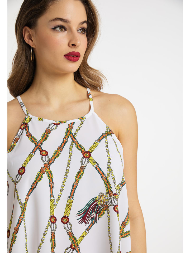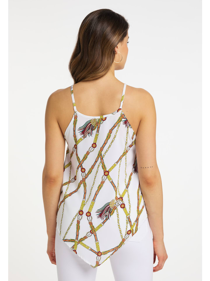 Легкая, шелковистая и струящаяся ткань украшена элегантным принтом с кисточками, пряжками и цепочками. Свободный, расслабленный силуэт сужается к низу, придавая топу треугольную форму. Тонкие бретельки завершают элегантный образ. Создайте изысканный наряд, надев топ под пиджак или самостоятельно с узкими брюками.