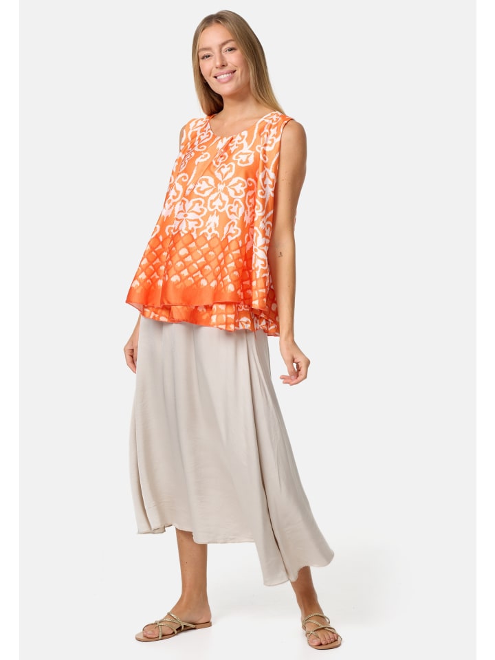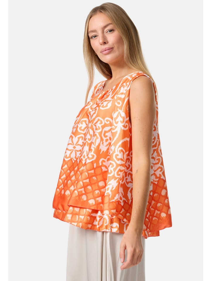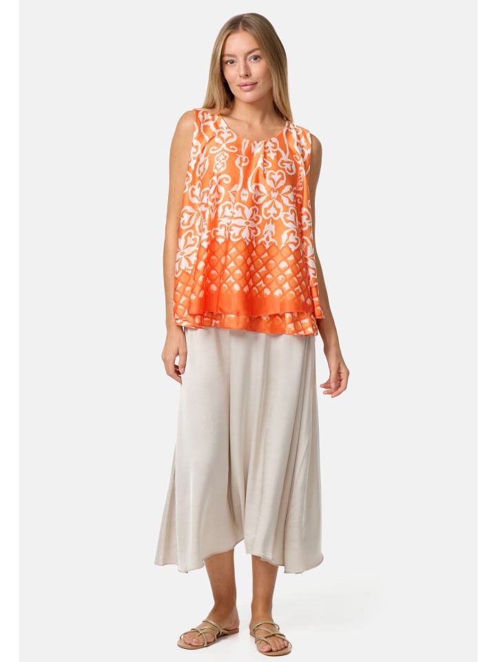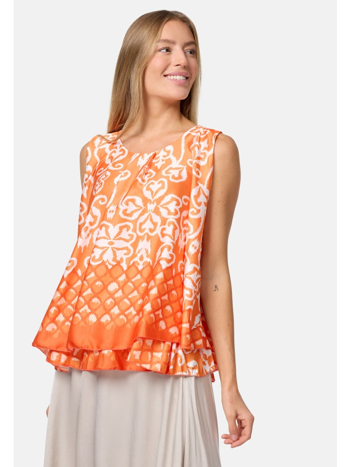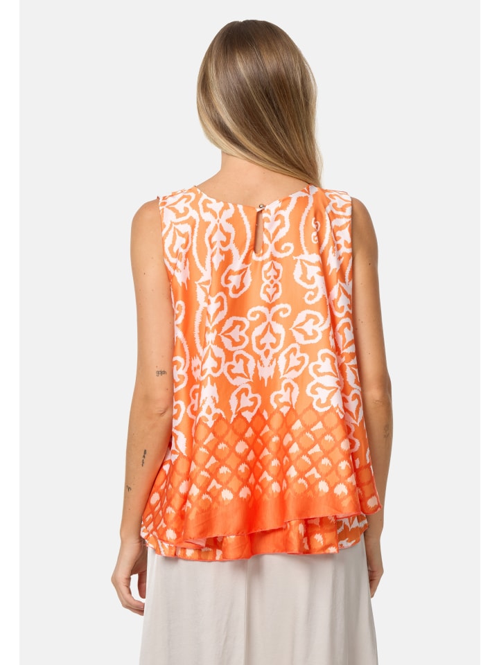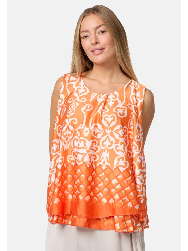Элегантный женский атласный топ без рукавов с накладкой и ярким принтом. Этот топ, украшенный струящимися линиями и орнаментами, имеет свободный крой. Грациозно драпирующийся материал свободно облегает фигуру. Внешний атласный слой этого легкого топа без рукавов шелковистый и приятный на ощупь, а подкладка выполнена из приятного для кожи трикотажа. Оба слоя мягко драпируются, создавая элегантный дизайн, который дополняет маленькая пуговица на затылке. Яркие цвета и блестящий материал делают этот модный летний топ настоящим украшением. Круглый вырез горловины украшен декоративной складкой.