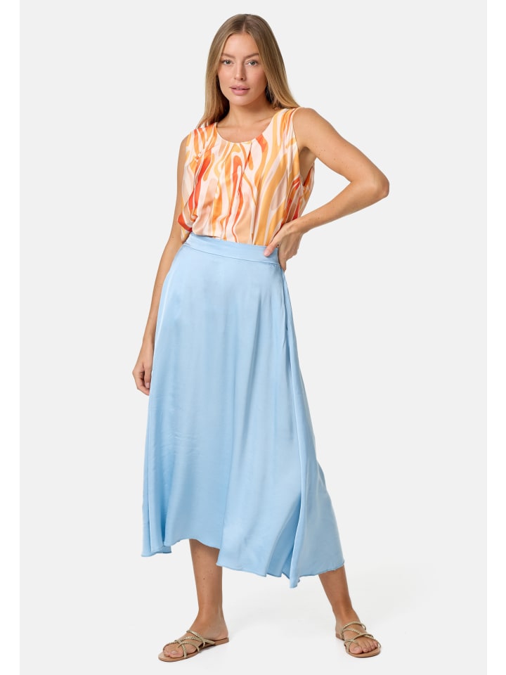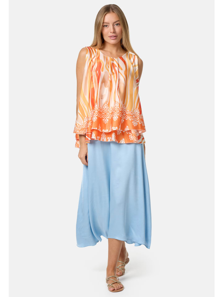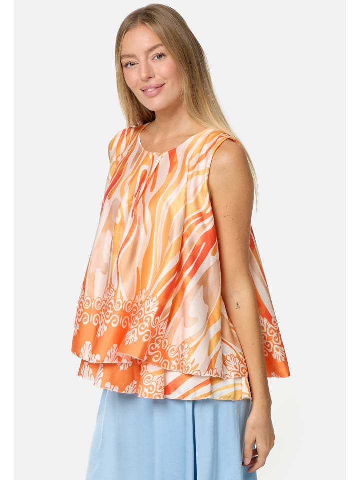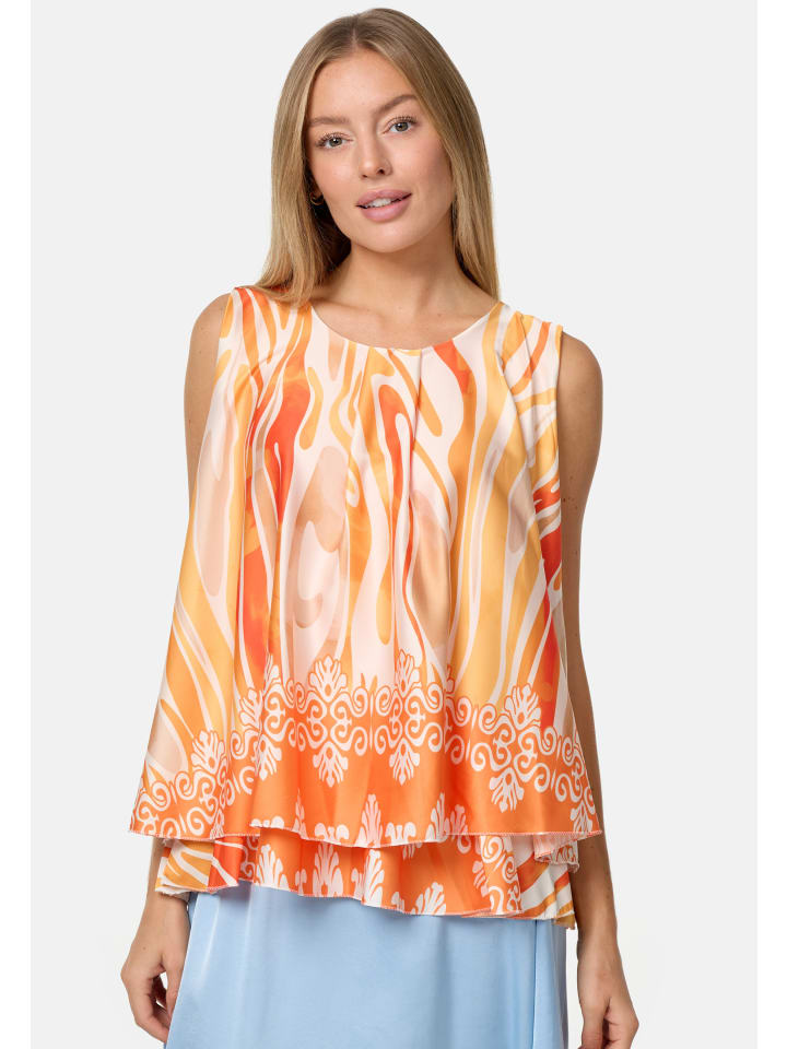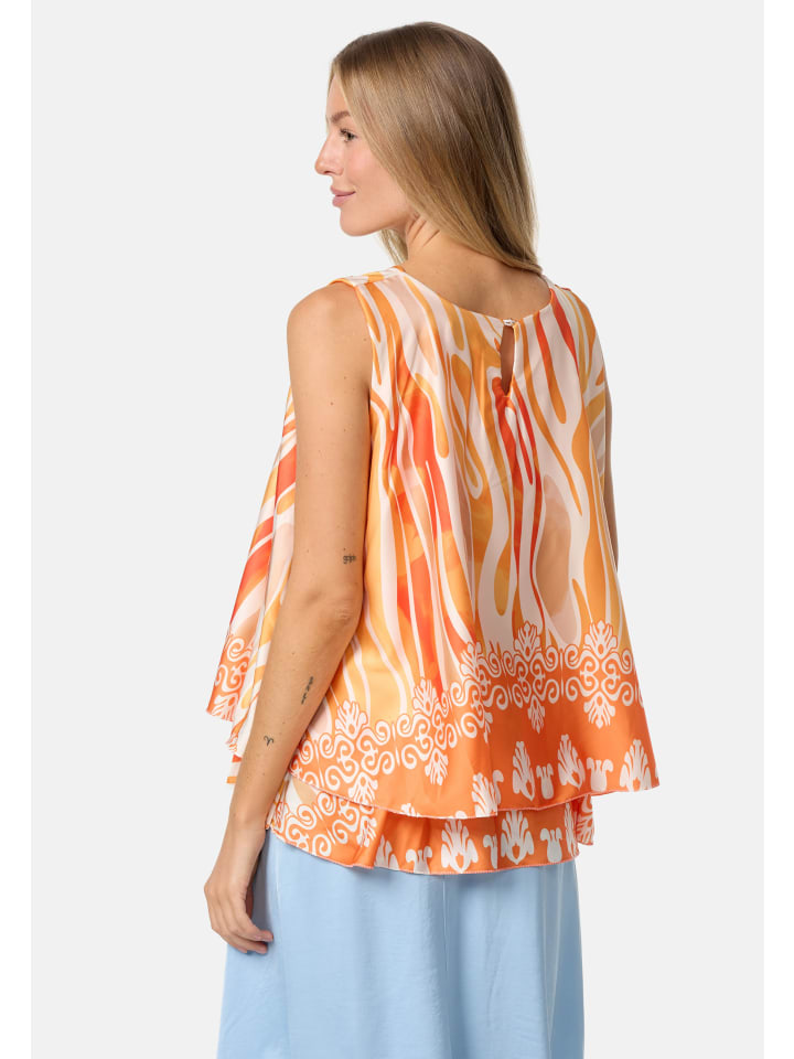 Элегантный женский атласный топ без рукавов с накладкой и ярким принтом. Этот топ, украшенный струящимися линиями и орнаментами, имеет свободный крой. Грациозно драпирующийся материал свободно облегает фигуру. Внешний атласный слой этого легкого топа без рукавов шелковистый и приятный на ощупь, а подкладка выполнена из приятного для кожи трикотажа. Оба слоя мягко драпируются, создавая элегантный дизайн, который дополняет маленькая пуговица на затылке. Яркие цвета и блестящий материал делают этот модный летний топ настоящим украшением. Круглый вырез горловины украшен декоративной складкой.