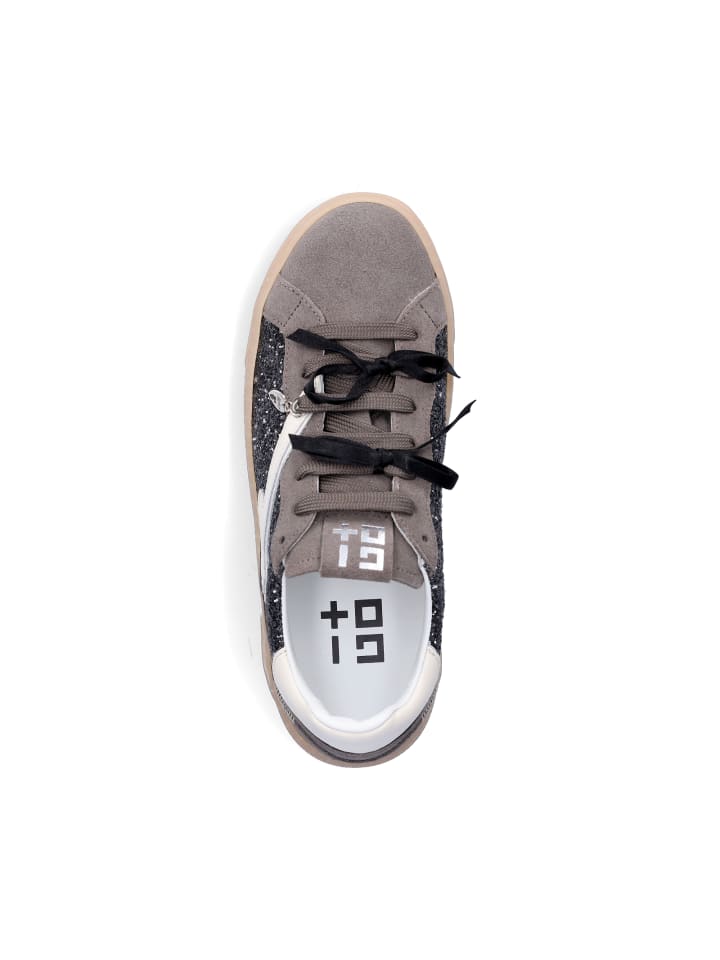 Женские кроссовки Gio+ из серой замши и серого синтетического материала с блестками, шнуровкой, съемной стелькой из искусственной кожи и подкладкой из кожи и махровой ткани.