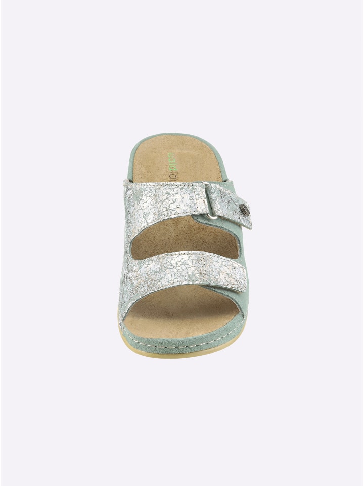 Эти мюли Waldläufer сочетают в себе безупречный стиль и невероятную легкость. Верх выполнен из комбинации очень мягкой гладкой и замшевой кожи. Они имеют двойные, эффектно блестящие ремешки с регулируемой застежкой на липучке. Мюли полностью отделаны кожей внутри. Они оснащены нескользящей, гибкой полиуретановой подошвой и каблуком высотой около 40 мм. Ширина H подходит для более широкой стопы. Характеристики: стелька из пеноматериала с эффектом памяти, обтянутая кожей, ширина H, эффектный принт, очень мягкая кожа, стелька (другой материал), подкладка (кожа), подошва (другой материал), верх (кожа).