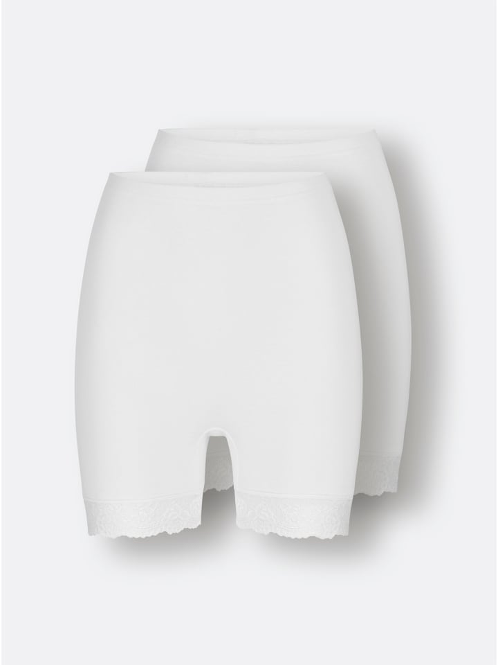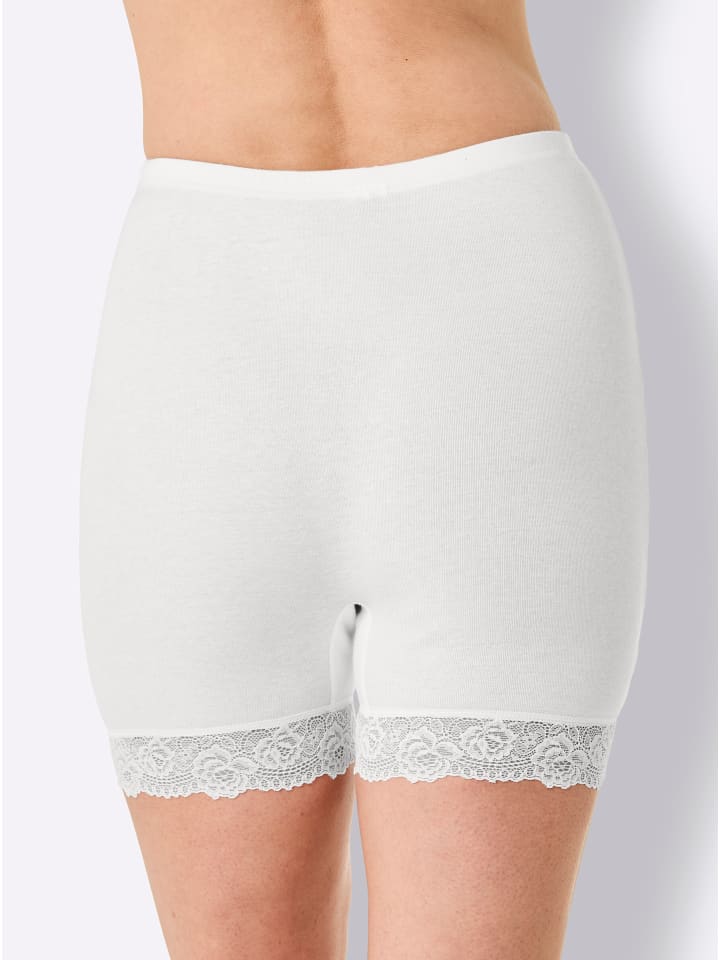 Комплект из 2 штук: трусики с длинными штанинами от Wäschepur с мягким поясом. Края штанин украшены привлекательной кружевной отделкой. С двойной ластовицей. Тонкая ребристая вязка. Сертифицировано GOTS.