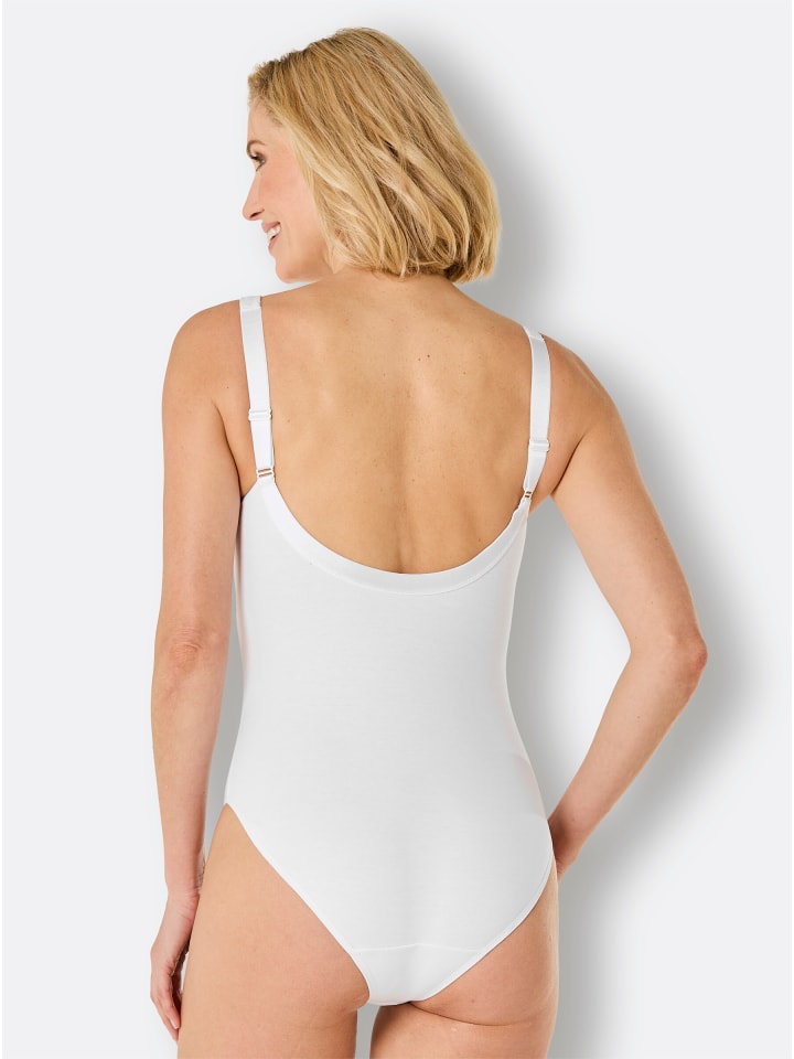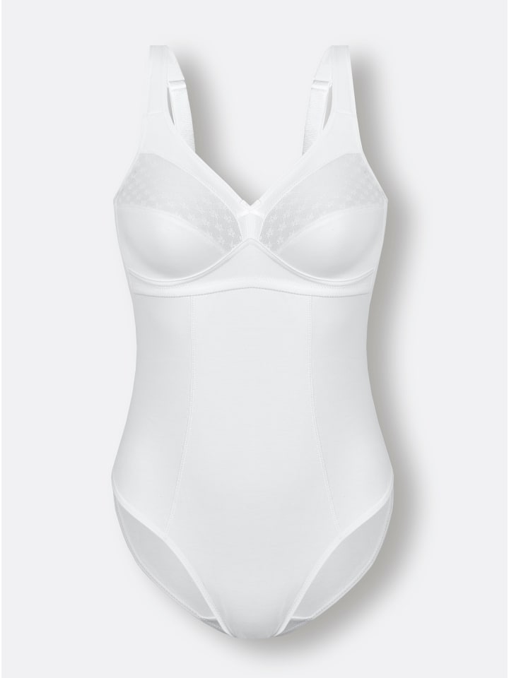 Суперкомфортный, абсолютно красивый: боди без косточек от Wäschepur. Имеет отделку по линии декольте и изящную кружевную отделку на верхней части чашечек. Широкие, мягкие бретели регулируются сзади. Усиленная передняя панель искусно скрывает область живота. Застежка на крючки и петли в области промежности и хлопковая ластовица. Поддерживает инициативу «Хлопок, произведенный в Африке».
